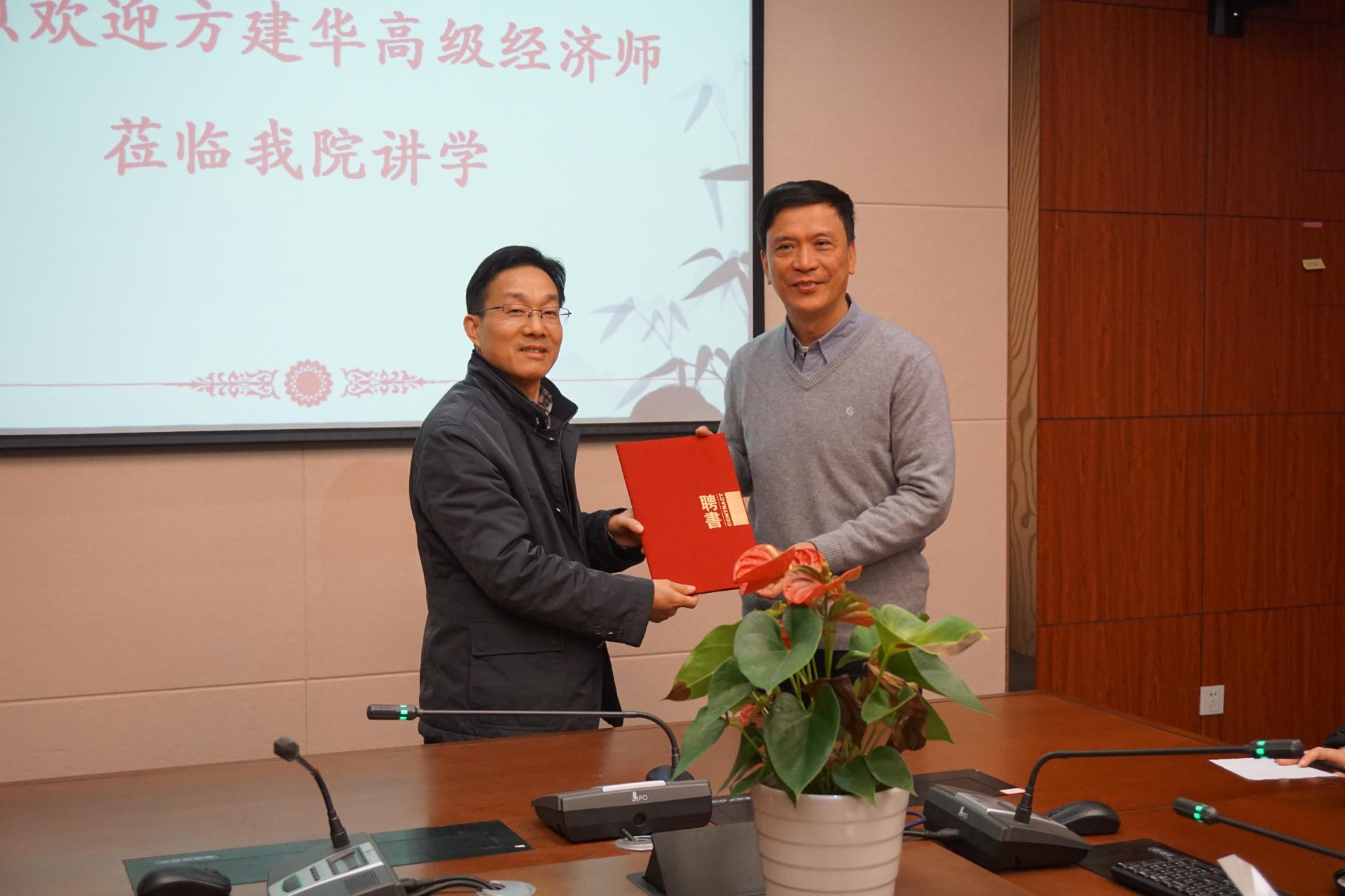 讲座前,举行了简短的兼职教授聘任仪式,校党委副书记卢新波教授为其颁发了聘任证书。