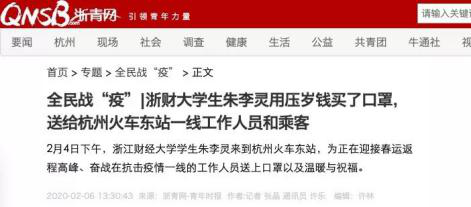 团员青年朱李灵同学在看到疫情之后,第一时间联系学校团委“一元钱”工程的负责人,表达自己想用压岁钱购买应急物资,驰援疫情防控一线的心愿,终于通过校团委辗转来回采购了3000个口罩,最终在2月4日下午送到了杭州火车东站工作人员手中,为正在迎接春运返程高峰、奋战在抗击疫情一线的工作人员送上温暖与祝福。同人漫画