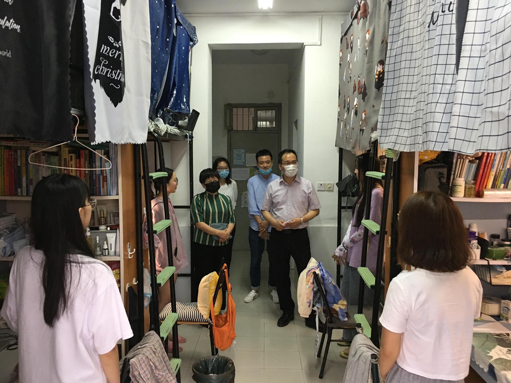 走访中,余书记与寝室同学们进行了亲切的交流,深入了解学生返校路途中的安全举措、在家线上学习情况以及返校后对学校生活学习环境的整体情况。他叮嘱同学们疫情防控期间要注意个人和寝室卫生,勤洗手、常通风,保持健康的生活习惯。了解到该寝室是我们学院设立的考研寝室,四位同学均有考研意向后,他鼓励她们明确奋斗目标,养成良好的学习和生活习惯,为将来继续深造和提升能力打下扎实基础。