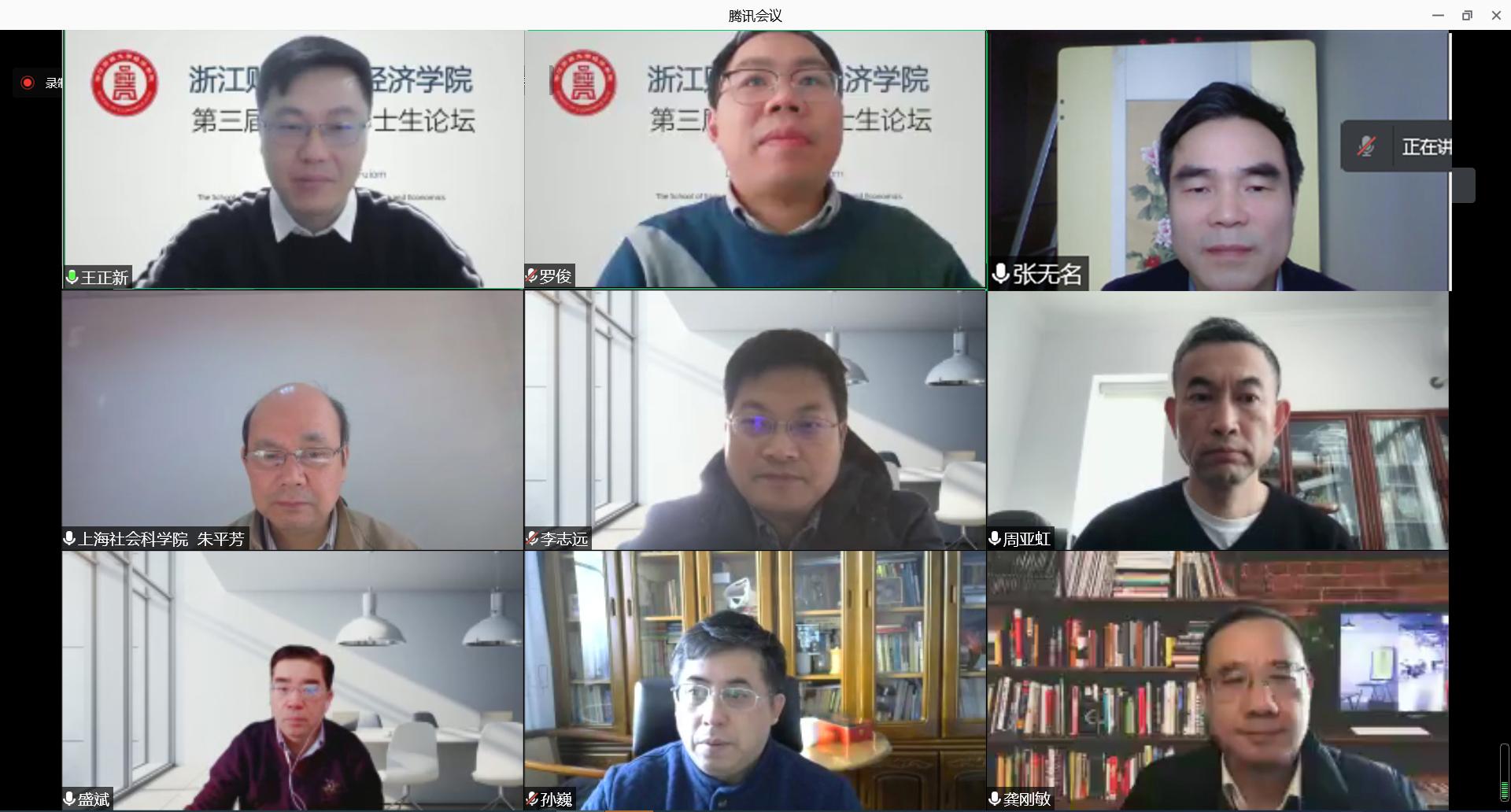 博士生报告环节,7名优秀论文入选者分别围绕国际贸易、人力资本、环境污染、数字经济、生育政策、扶贫政策、知识产权等研究主题做了论文报告,中国社会科学院李金华教授,上海财经大学周亚虹教授,上海社会科学院朱平芳教授,复旦大学的王弟海教授,浙江省社会科学院毛伟研究员,同人漫画