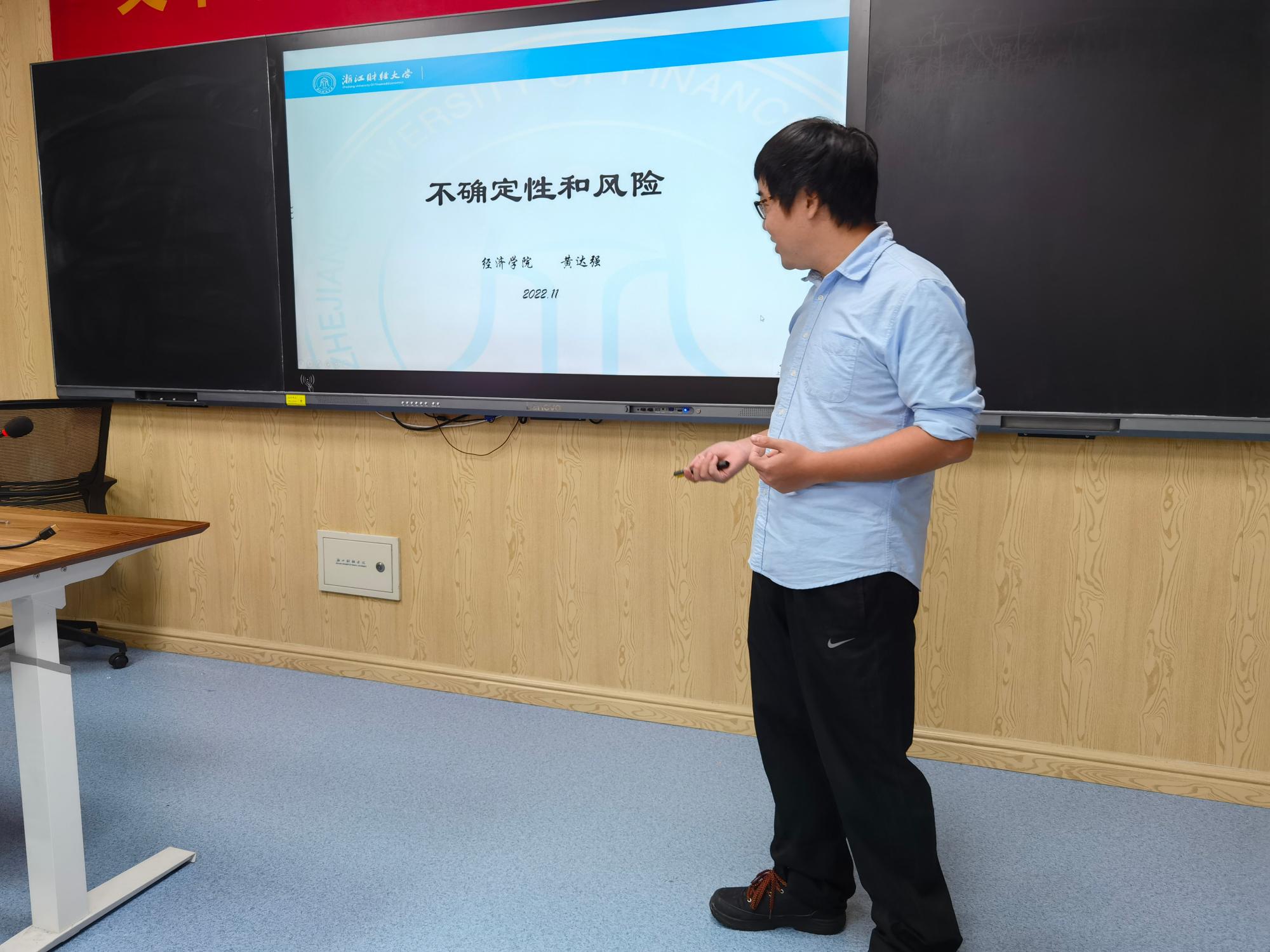 共有4位老师报名参加,具体为汪晓辉老师的《法与经济学》、丁峰老师的《妙趣横生的经济学》、程晓宇老师的《农业与农村经济学》、黄达强老师的《不确定性和风险》。辅导会上参赛教师依次对自己的授课课程进行了教学创新设计展示,并结合教学实践经验,从教学内容、教学模式和教学评价等方面展示了课程教学的创新成效。