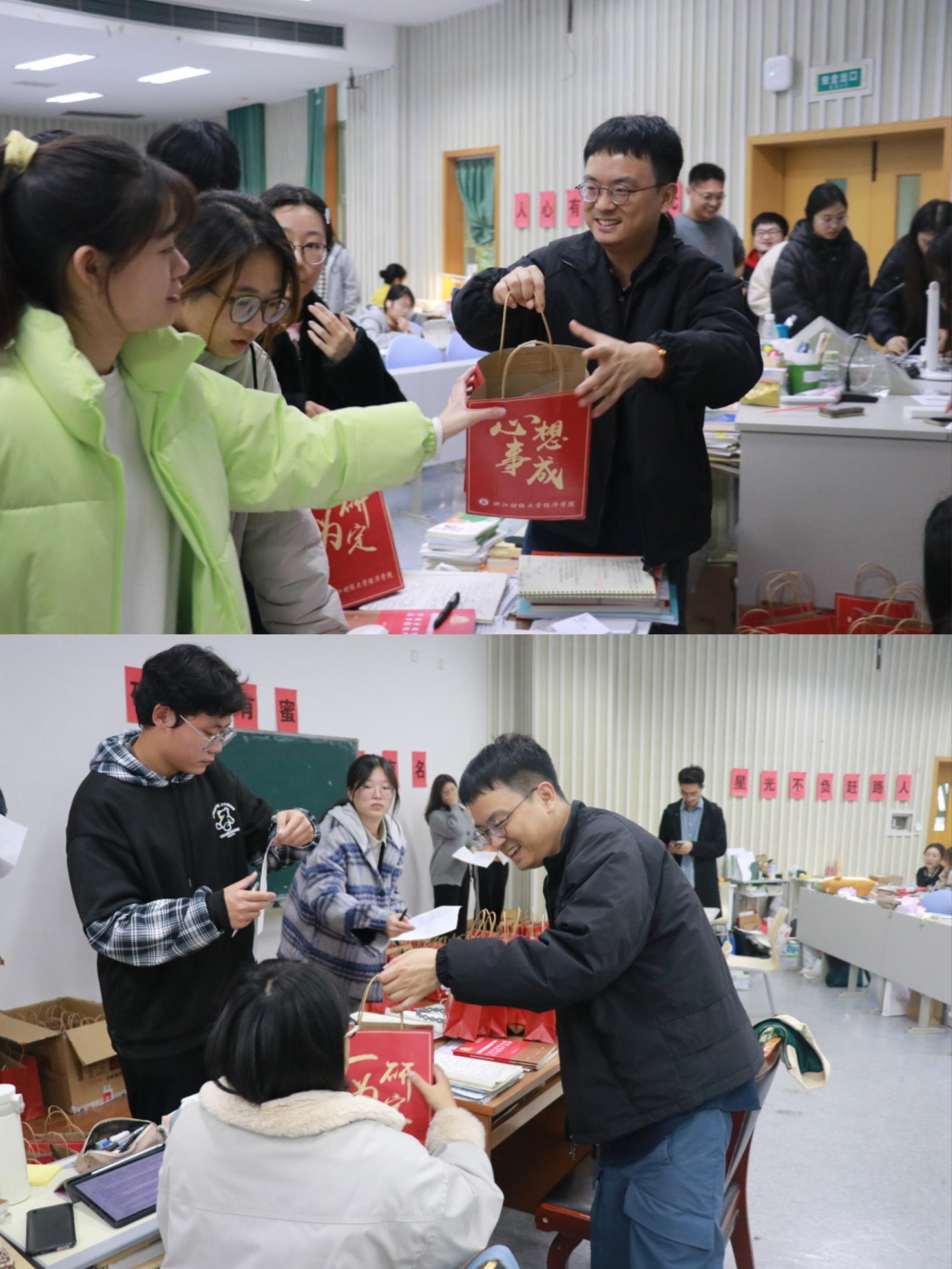 崔泰铭表达了对备考同学的关心问候,他充分肯定了大家勤奋刻苦、持之以恒的备考精神,并嘱咐大家坚定信念,放松心态,劳逸结合。随后,老师们将精心准备的“考研加油包”分发给备考同学。