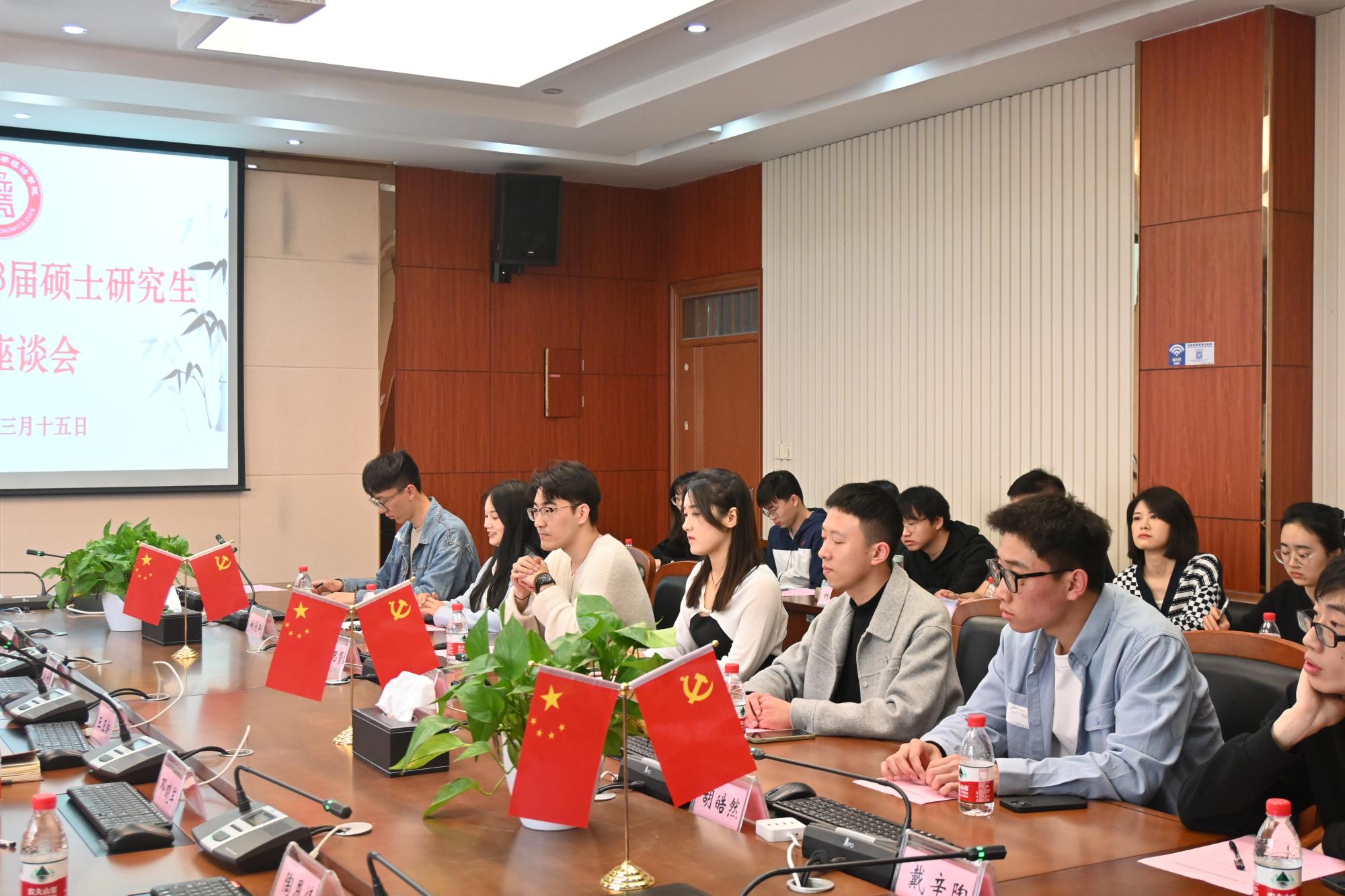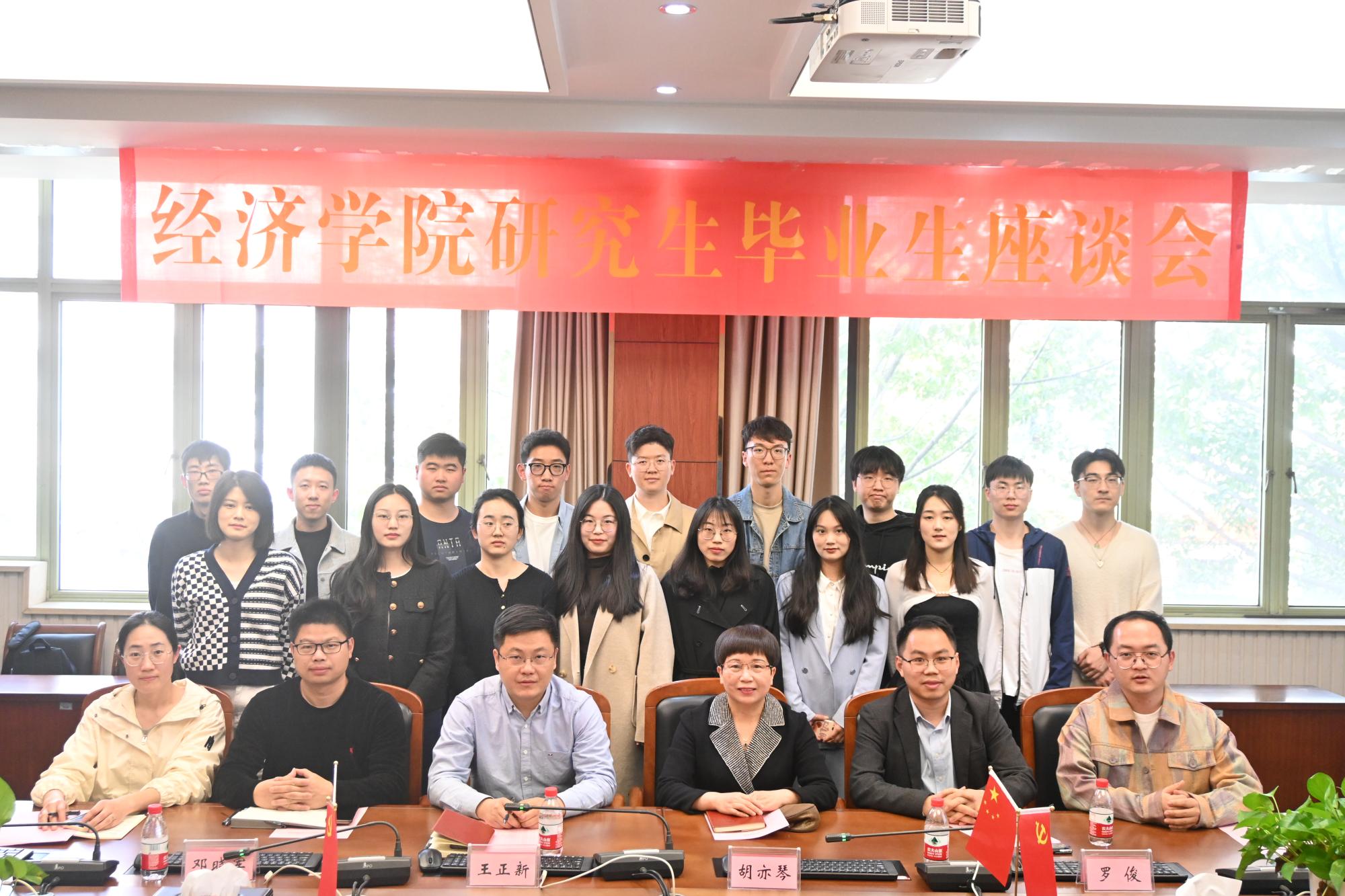 2023届硕士研究生毕业座谈会在学院楼210会议室举行。院长王正新、党委书记胡亦琴、副院长罗俊、邓晓军、研究生秘书陶恩情,以及辅导员俞一献与16位硕士研究生代表齐聚一堂,共话经院学习生活的感悟收获,畅谈人生未来的发展规划。会议由副院长罗俊主持。