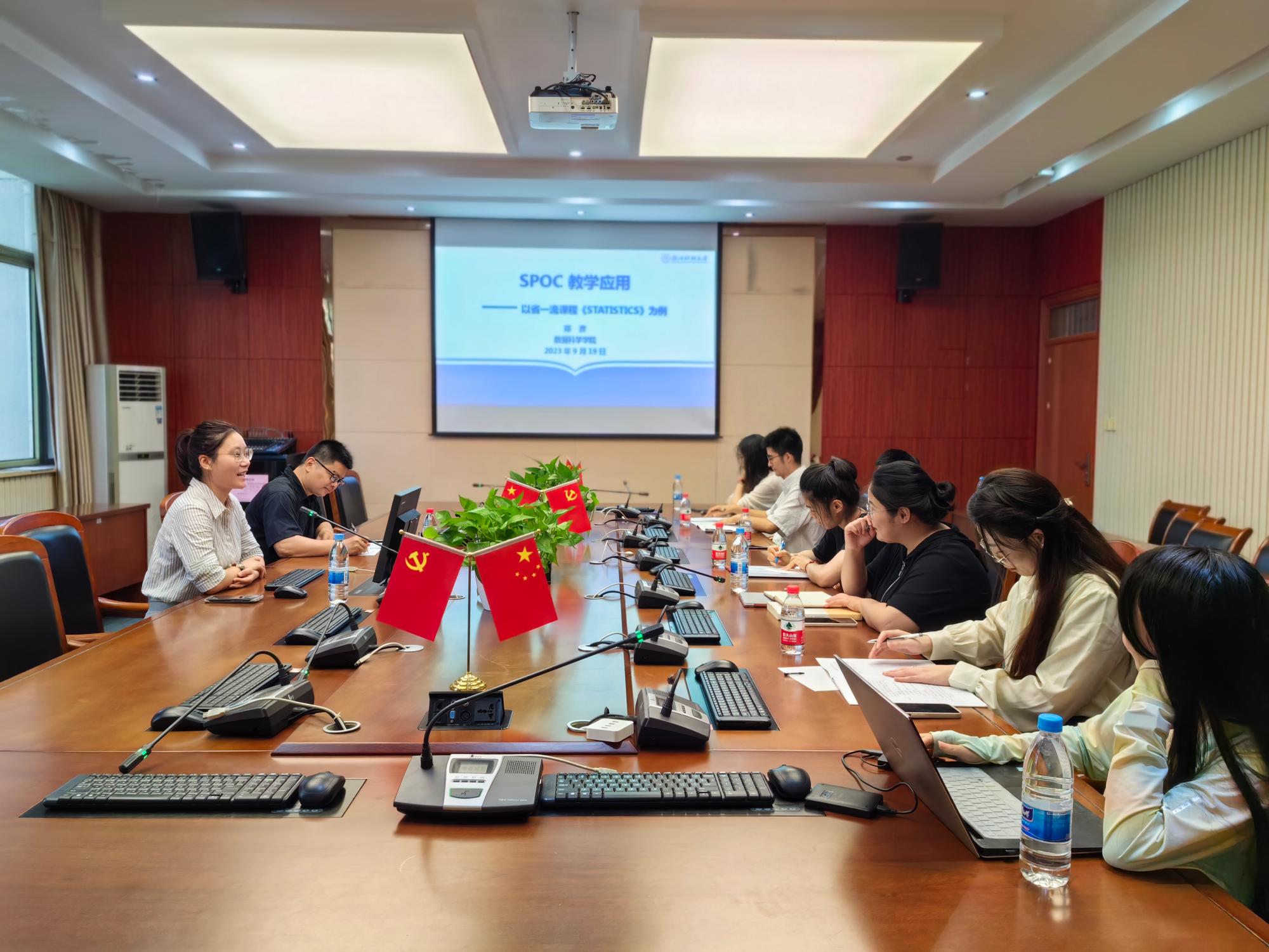 首先,邓晓军教授介绍了特邀主讲人郑彦博士的教学科研情况,并简要介绍了本次讲座的主题和内容。接下来,郑彦博士围绕三个基本问题,即“何为MOOC与SPOC?”“选择MOOC or SPOC?”以及“如何应用SPOC?”,以省一流国际化线上线下混合式课程《Statistics》课程为例,介绍SPOC教学应用。最后,与会的老师们与郑彦博士就一流课程建设过程中遇到的困难和解决办法展开了热烈讨论。