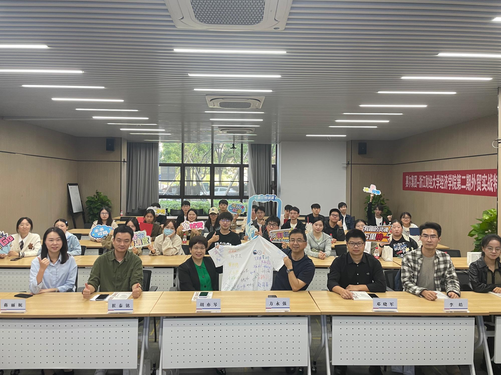 与宁波赛尔集团合作的第二期外贸实战特训营“结营仪式”在宁波赛尔大厦成功举办。宁波赛尔集团副总裁方永强、招聘经理蒋丽妮、特训营班主任刘孜,学院党委书记胡亦琴、党委副书记崔泰铭、副院长邓晓军,及特训营工作人员、学院辅导员、特训营学员代表共同出席仪式。