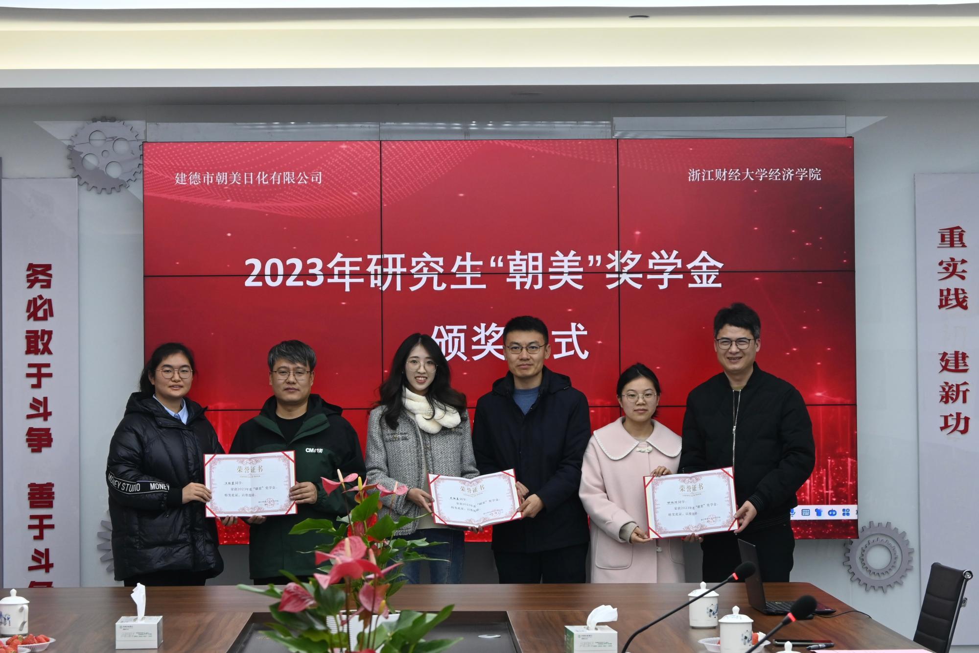 1月13日下午,第二届研究生“朝美”奖学金颁奖仪式在建德市朝美日化有限公司举行。建德市校友会秘书长胡志平,公司副总经理、学院创业导师朱利平、胡庆辉,以及学院院长罗俊,党委副书记徐丽玲,副院长王岭、副院长邓晓军等出席仪式并为获奖学生颁奖。活动由副院长邓晓军主持。