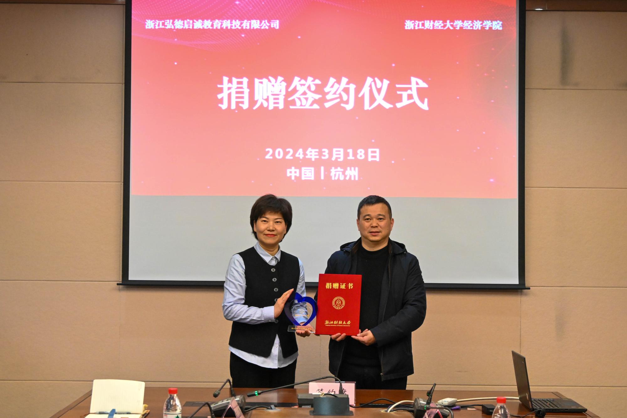 罗俊院长代表学院接受弘德启诚教育董事、总经理冯雪林的捐赠支票。吴玻主任向弘德教育副总裁金海芬颁发捐赠证书和捐赠奖杯。