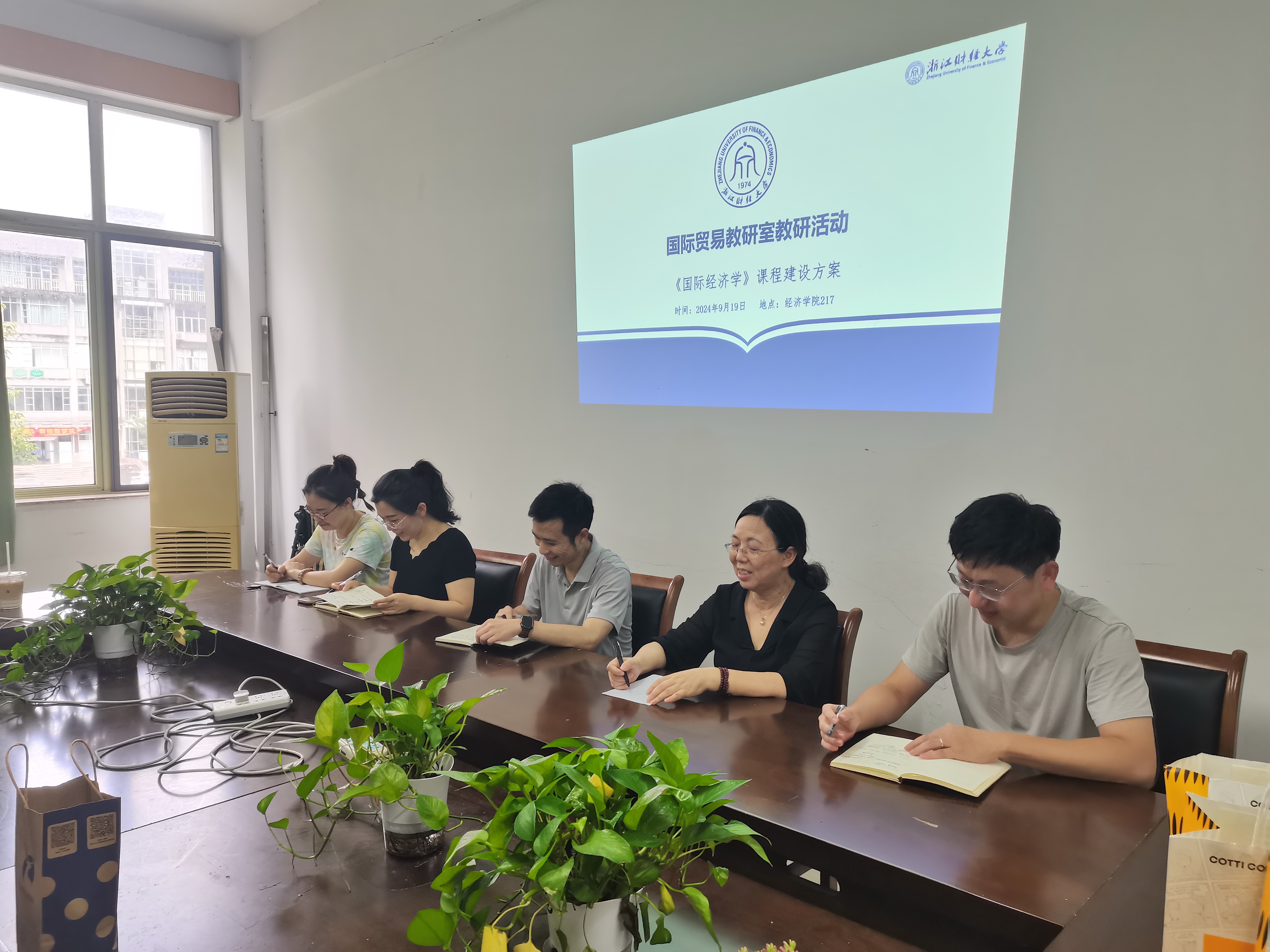 217会议室召开《国际经济学》课程建设研讨会。会议由国际贸易教研室主任方杰炜主持,并邀请了浙江经济研究院院长李晓钟教授来会指导。其他参与会议的老师还包括国际贸易系系主任冯阔老师、国际贸易系蔡琬琳、郭志芳以及张懿老师。