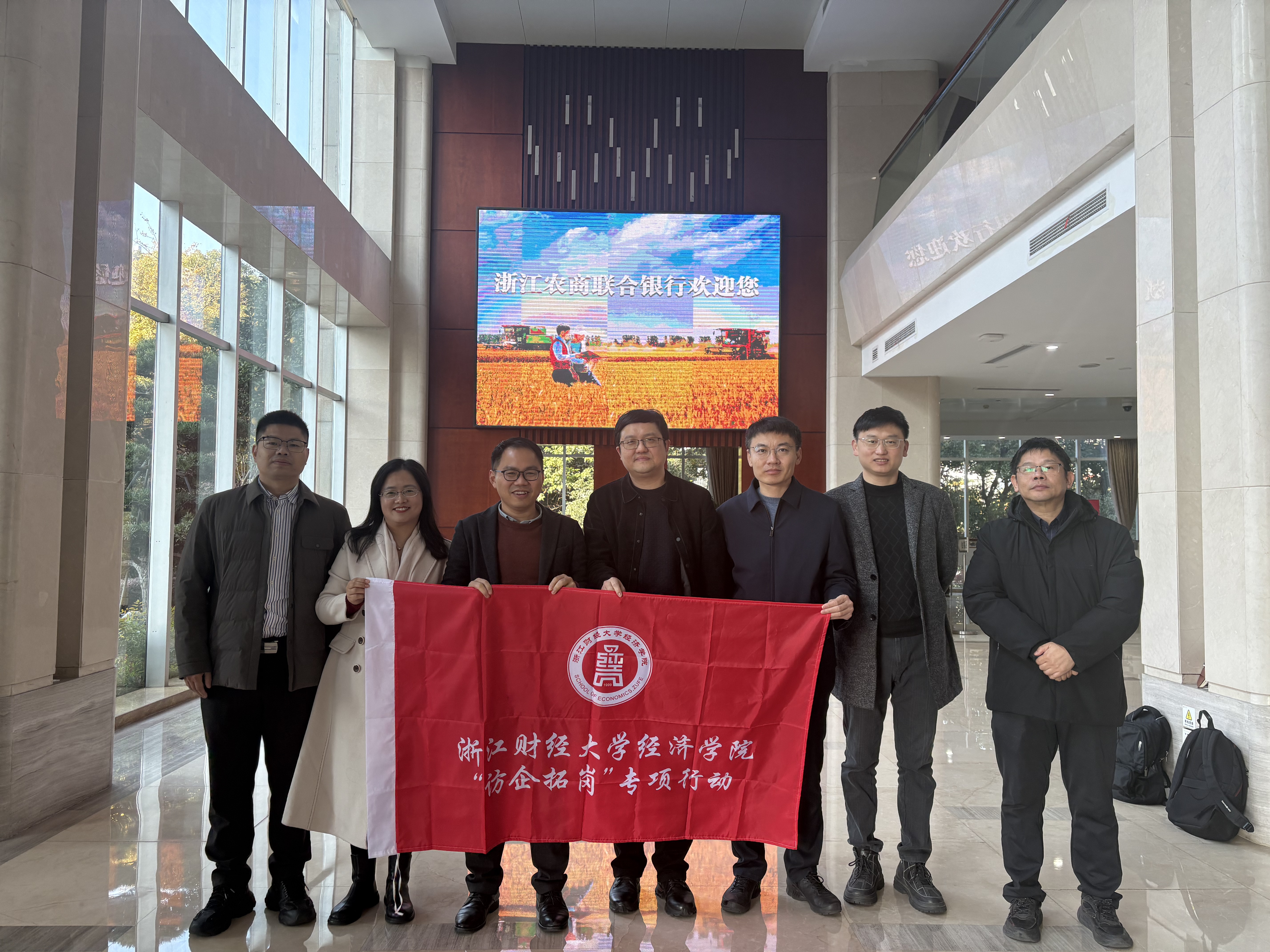 为推动学院产教融合和学生高质量就业,12月4日,学院院长罗俊、党委副书记徐丽玲、副院长王岭、副院长邓晓军、国际贸易专业负责人吴宏、国际贸易系主任冯阔等一行人赴浙江农村商业联合银行股份有限公司、杭州杭钢对外经济贸易有限公司开展调研交流。