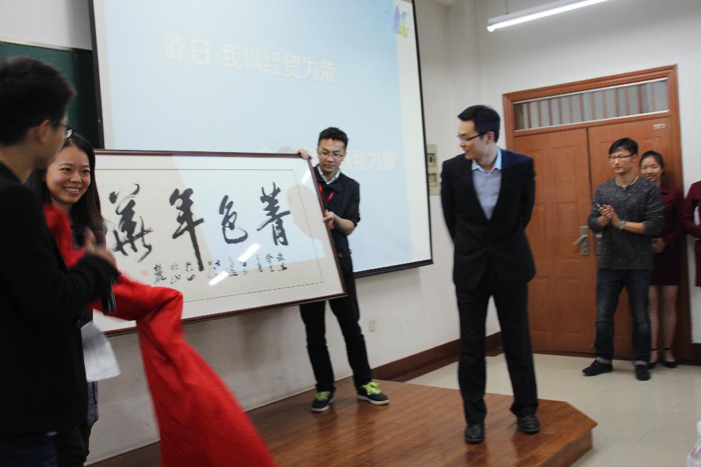 活动由梦想学员代表发言拉开序幕,随后,三位学长赠给学院和新一届经贸人“菁色年华”四个大字。作为回赠,同人漫画