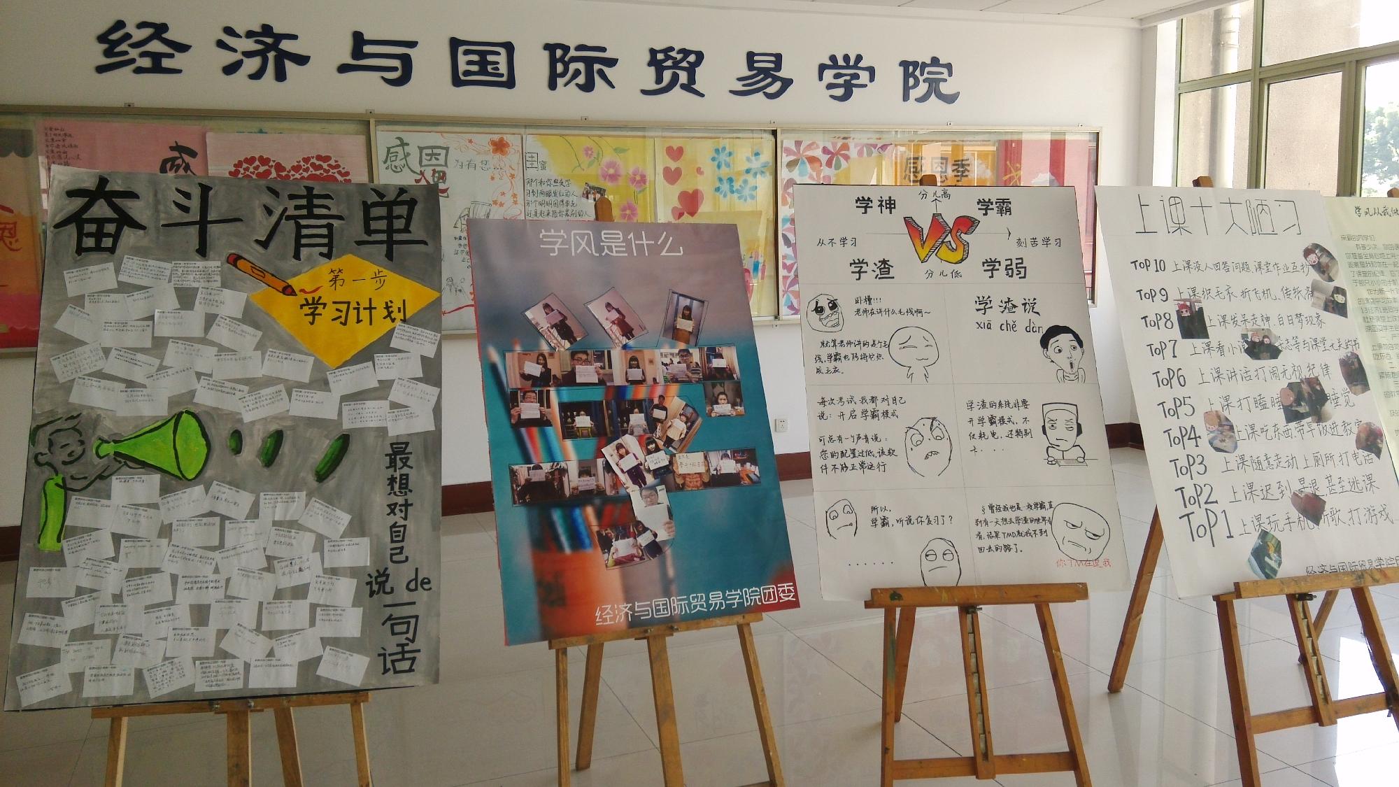 走进经济与国际贸易学院楼,首先映入眼帘的是一排学生自制的以“学风”为主题的宣传展示海报。3月份是经济与国际贸易学院的学风建设月,学生围绕这一主题开展了如成绩分析会、无手机课堂、奋斗清单、老生新生Day Day Up等形式多样的活动。