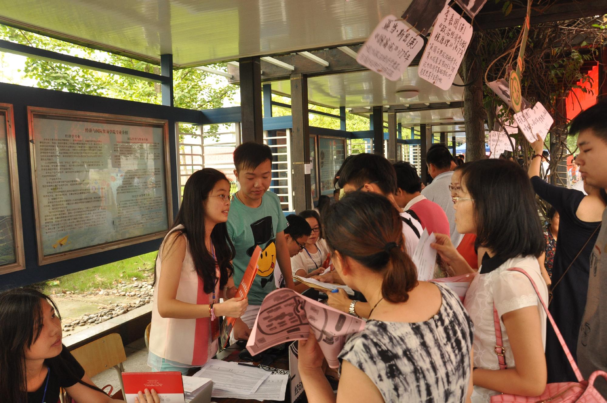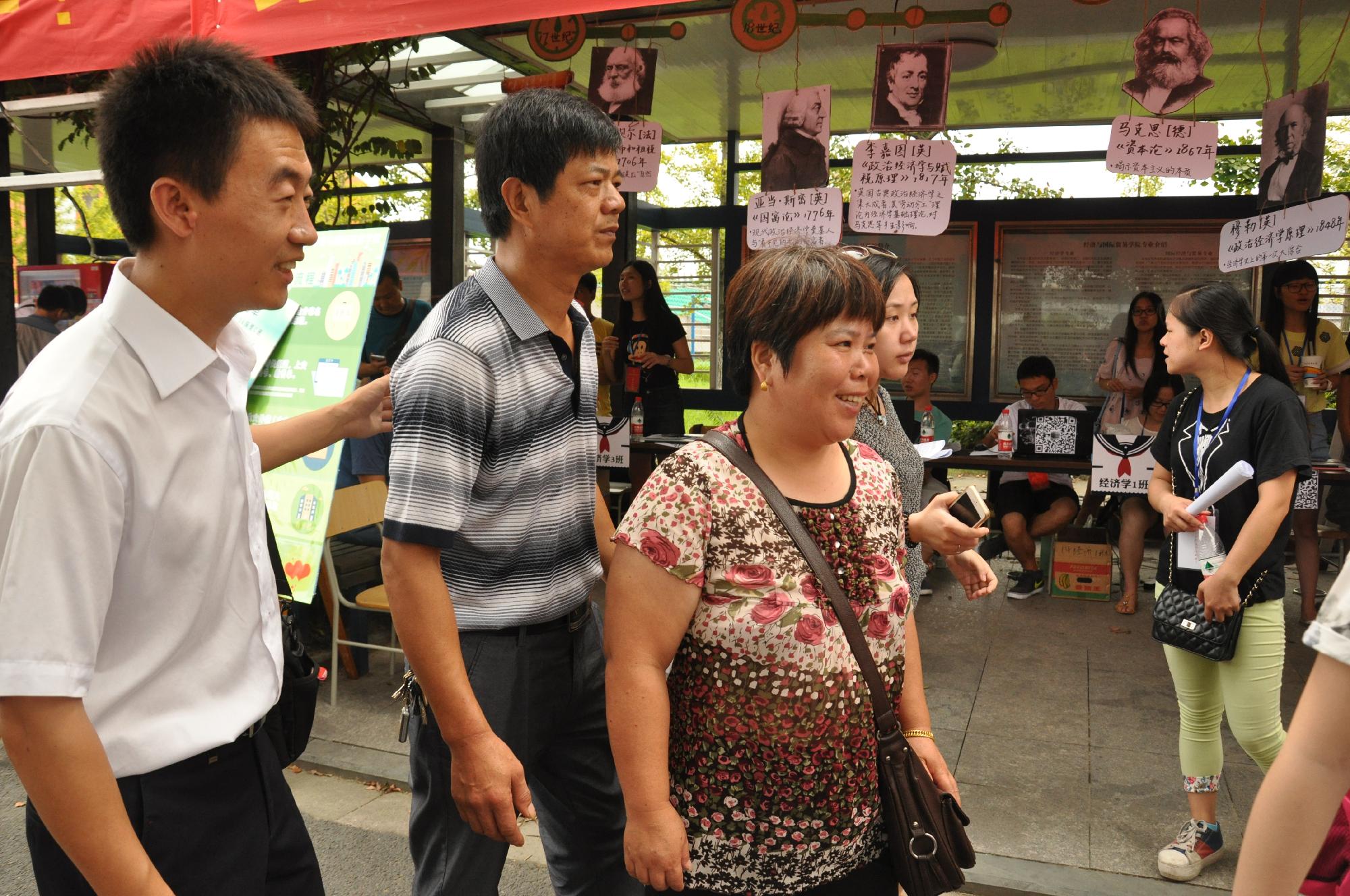 迎风飞扬的彩旗,鲜艳的欢迎横幅,以及众多经济学家的照片和简介,让整个迎新氛围温馨而舒适。此次迎新,经贸学院特别推出了爱心笑脸墙合影活动,为新生们拍下进入大学的第一张照片,让所有经贸新生和家长一同体会上大学的喜悦。“恰同学少年,人生正豪迈,随我一同,梦想远航”,爱心墙上的标语也正是新生们此时此刻的心情。