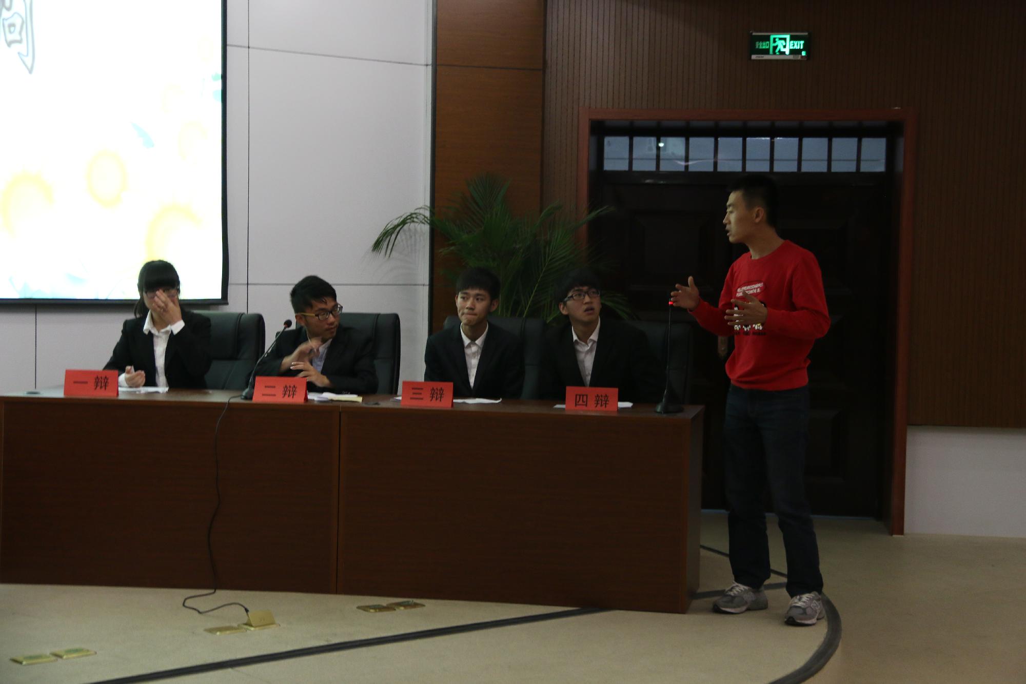 11月2日晚6:30,经贸学院2014级新生辩论赛决赛在学院楼219报告厅举行。14国贸2班和14经济2班展开了激烈争夺,最后14经济2班摘得桂冠。14国经班班主任邵慰、学院团委书记汪风易、辅导员赵聪、谭立娟到场观看了比赛。