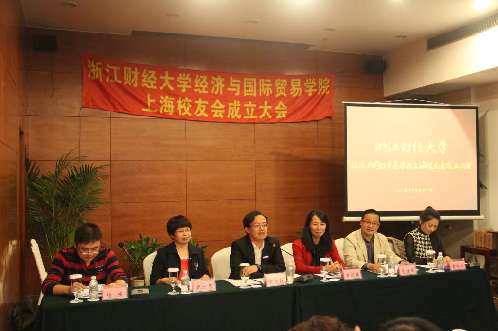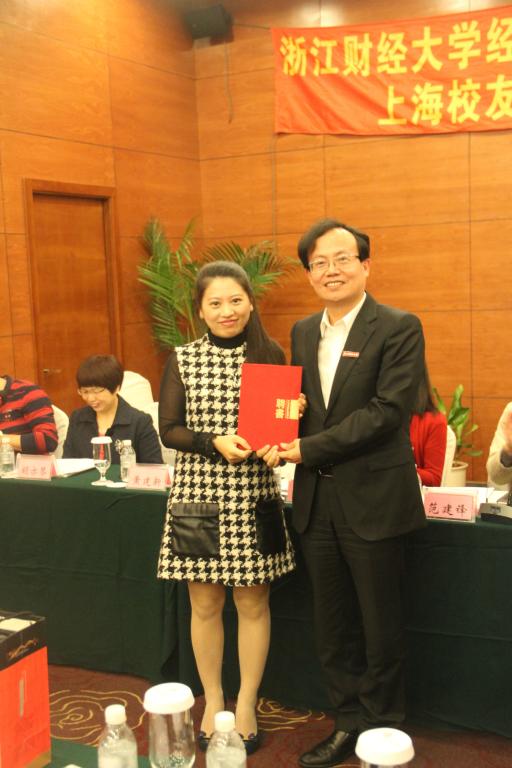 经济与国际贸易学院上海校友会章程》和首届理事会名单。黄建新副校长为经贸学院上海校友会会长、副会长颁发聘书,学院领导为经贸学院上海校友会进行授旗。经贸学院上海校友会会长黄伟伟代表发言,她用自己创造的“三首诗”表达了对校园生活的眷恋,对母校的感恩,对未来的美好憧憬,以及办好经贸学院上海校友会的决心。