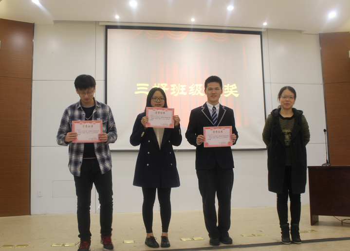 此次“三好班级”评比经过前期班级自主申报、评审小组材料审核等环节,终于在现场展示环节进入高潮。在展示中,各班代表从班级简介、工作特色、班委建设、党团组织建设、班风建设、舍风建设、文化活动等方面向在座的各位展示了各班取得的成果,通过精彩的PPT展示和富有激情的解说,展示了全班同学团结合作、热爱学习、积极进取、乐观向上的精神面貌,赢得在场老师和学生的一致好评。其中,14经济学实验班的同学通过精美的PPT向大家展示了班级优异的学业成绩与独具特色的学风建设;13国贸1班以系列图片秀向我们展示了班级的组织建设及所举办的各项活动……最终,14经济学实验班、13国贸1班及13国贸2班获得了“三好班级”荣誉称号,13经济1班等五个班级获得了特色班级荣誉称号。