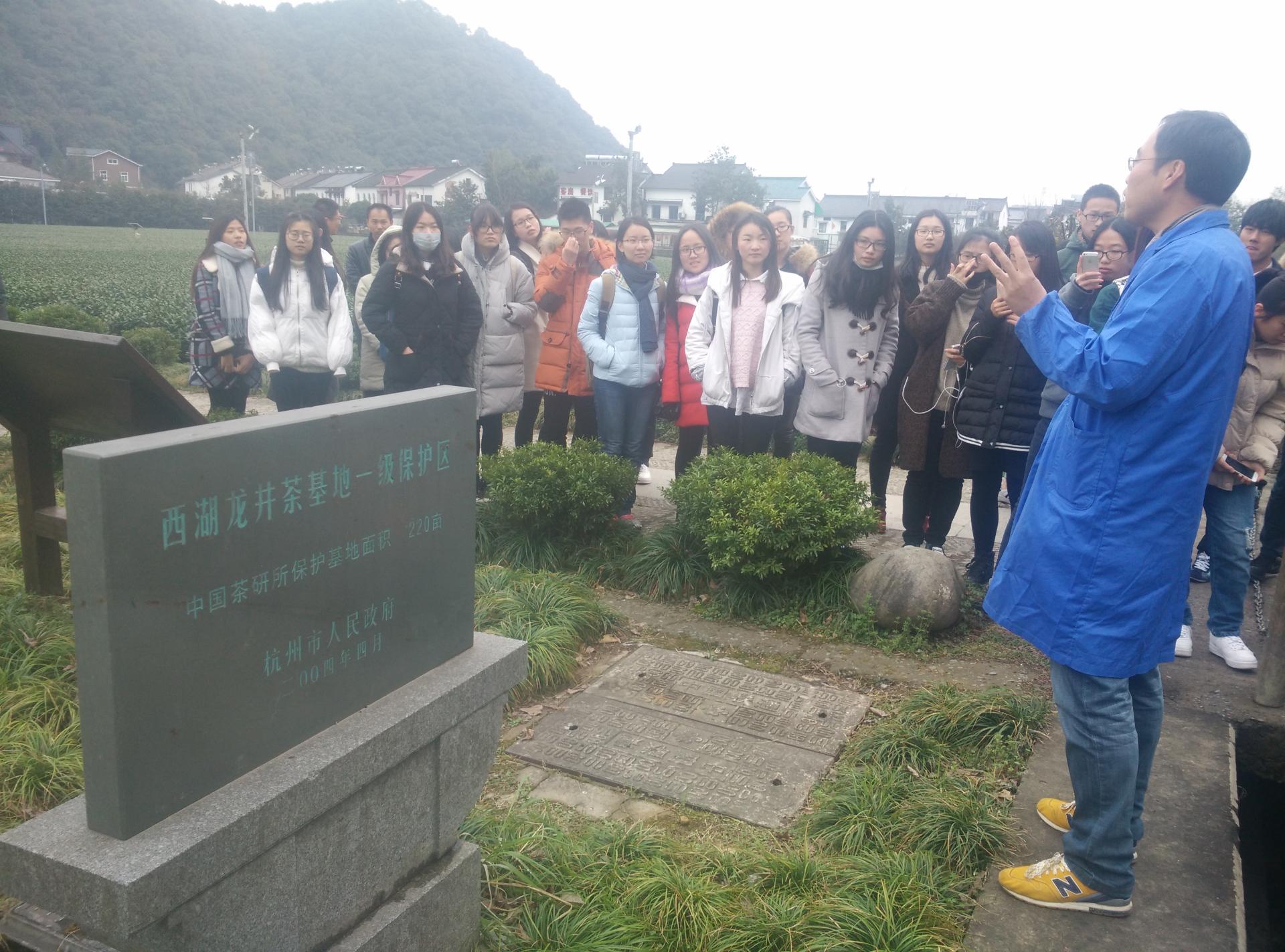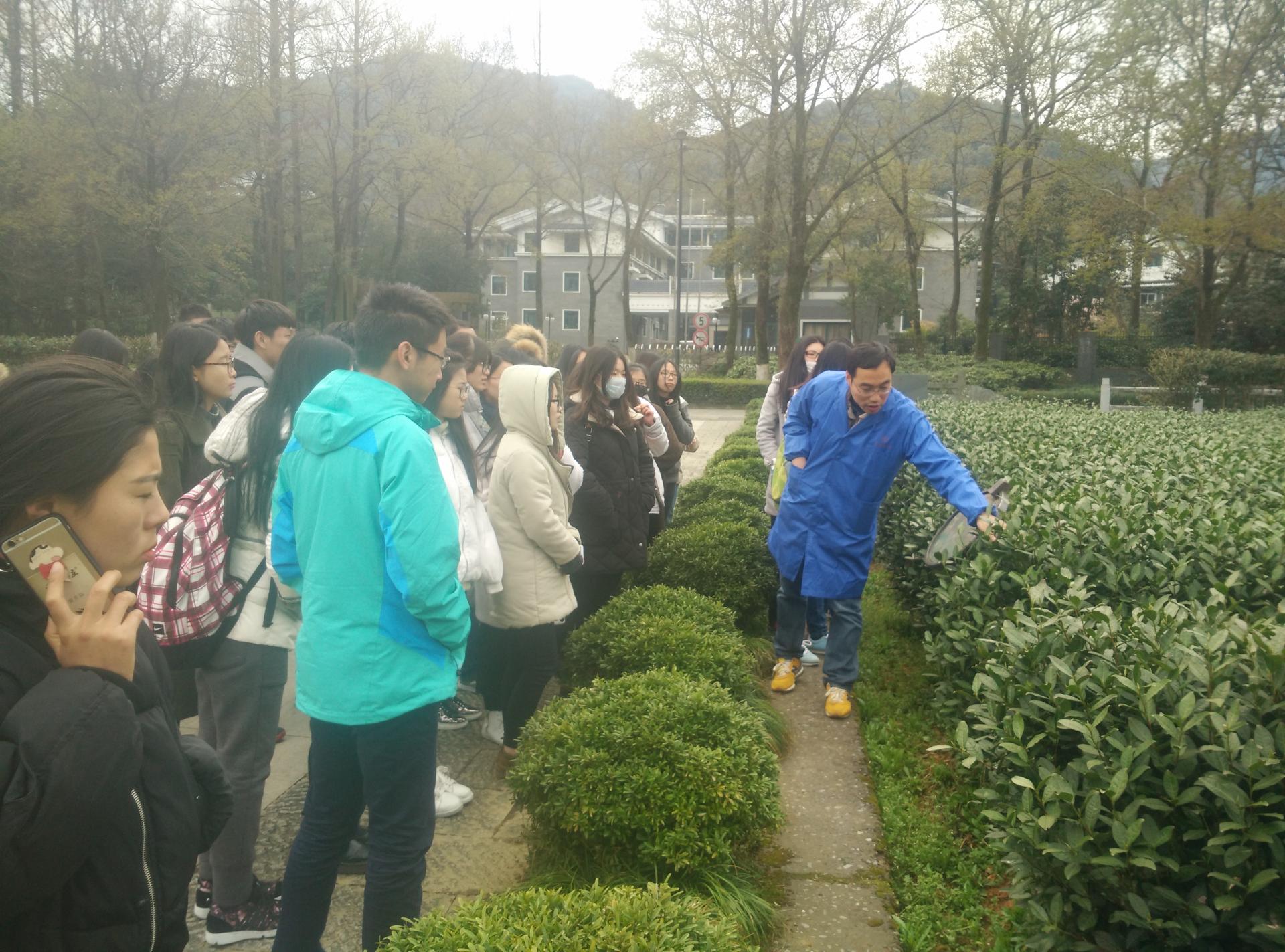 调研期间,汪旭明总监向同学们介绍了西湖龙井茶的产地、品级、种植技术和病虫害防治方法,并带同学们实地考察了西湖龙井茶的种植基地和制茶车间。针对同学们对炒茶工艺的好奇心,汪总向大家解释了机器制茶和人工炒茶的区别,并细致讲解了炒茶的各个步骤。随后,在陈福桥研究员的带领下,师生们参观了茶研所展厅,了解了我国茶叶种植的历史、各种茶叶品种和制茶工具。为了让同学们切身体会不同茶叶品种的味道区分,师生们还一起去到了种植基地实地采茶品尝。