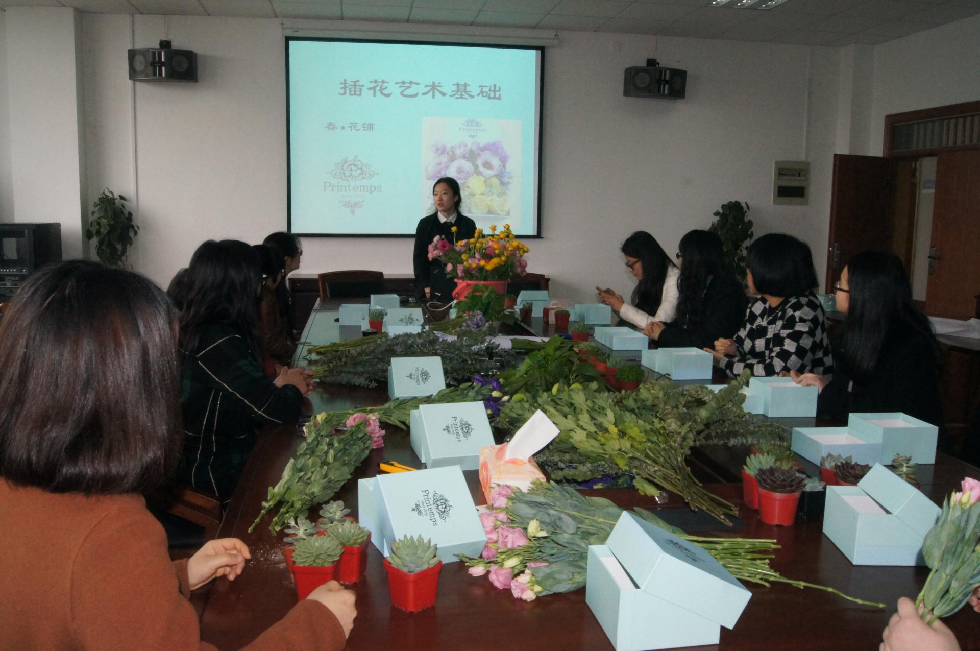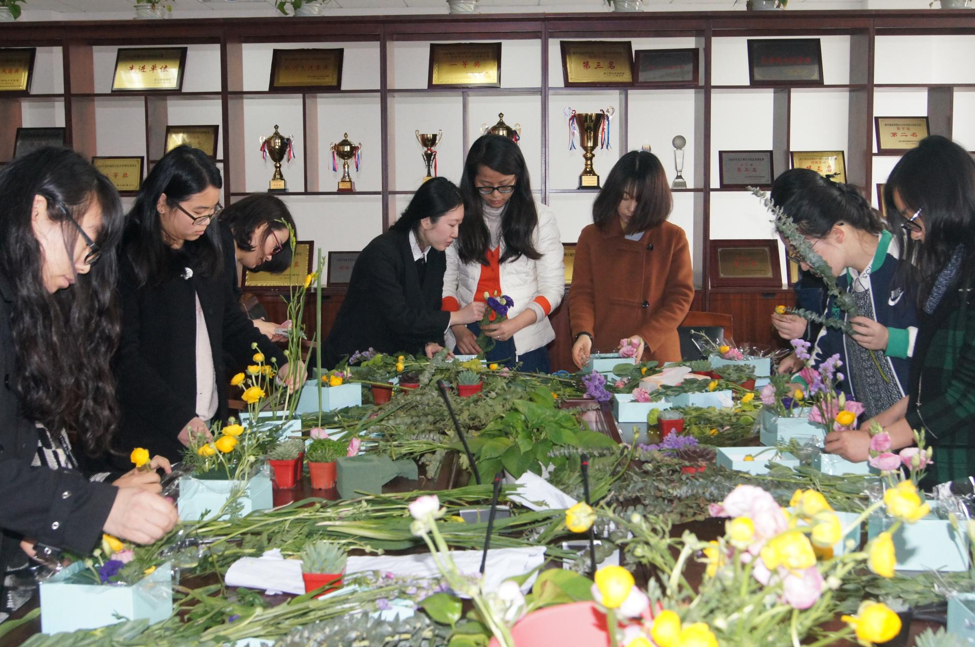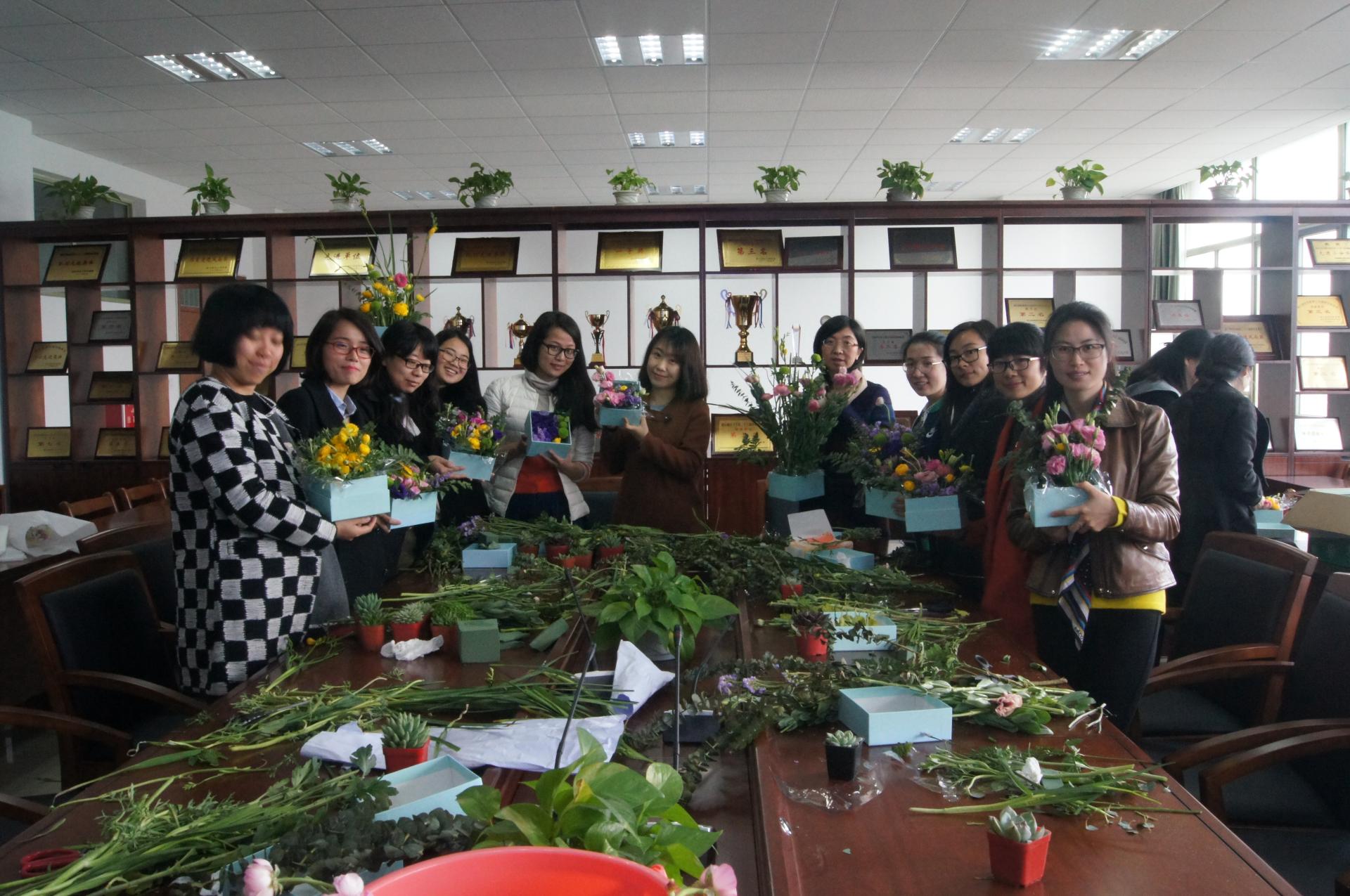 工会在6号学院楼313会议室开展了以“姹紫嫣红春有时,五颜六色竞争艳”为主题的插花活动,学院全体女教职工都踊跃参与了此次活动。