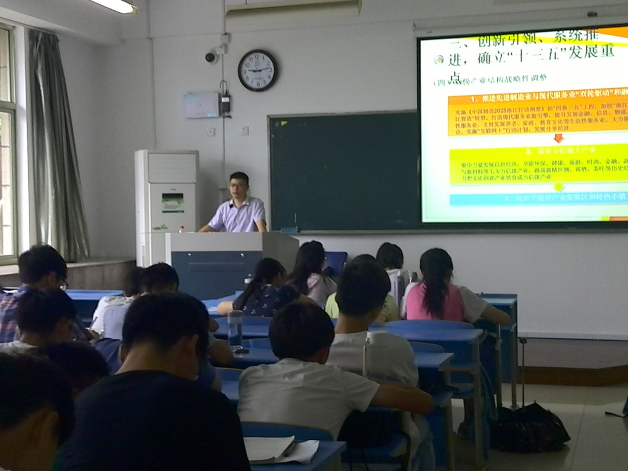 6月12日上午,浙江省发展规划研究院大江东办事处主任魏李鹏为15级经济学专业和城乡规划专业的同学作了关于我省“十三五”转型发展的专题讲座。任光辉老师主持。