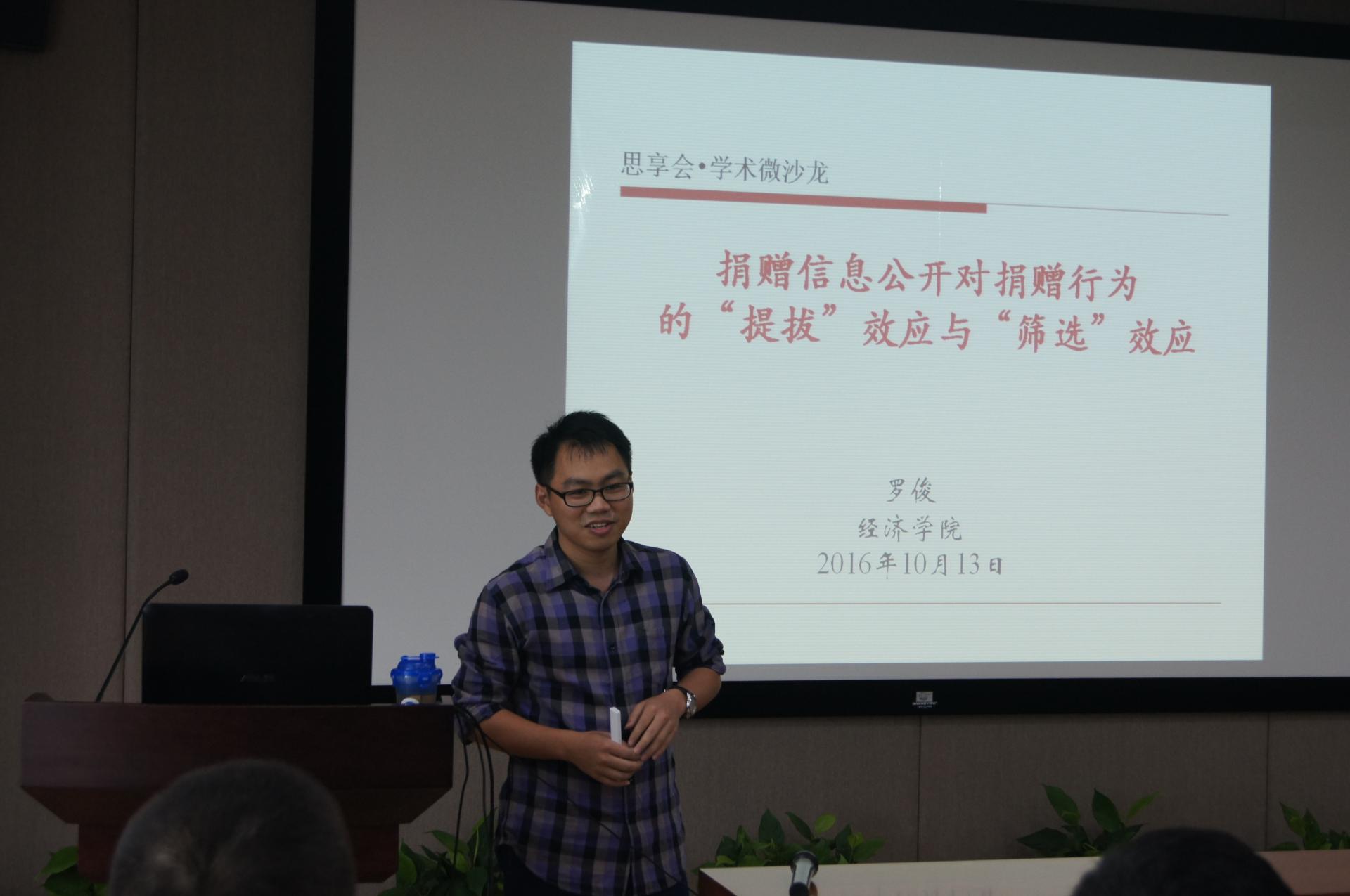 罗俊博士从中国慈善捐赠事业的特点、国内有关慈善捐赠的研究现状、中国慈善捐赠事业的发展趋势出发,提出了研究中国情境下个人慈善捐赠行为动机的必要性。进而通过介绍国外有关捐赠信息公开下的慈善捐赠行为研究,并结合中国现实文化情境,认为以往研究所发现的公开捐赠信息对捐赠行为的促进作用只是在无法退出的强制性公开捐赠信息情况下的特例,从而提出了捐赠信息公开引致声誉动机对捐赠行为的作用可能存在两种机理,即捐款数额较小的人会通过退出捐赠而避免捐赠信息公开的“筛选效应”,捐款数额较大的人会因为捐赠信息公开而提高捐款数额的“提拔效应”。在这一假设的基础上,构建了一个不同捐赠信息公开程度的个人慈善捐赠行为模型,并通过田野实验的方式,设计了五组捐赠信息公开的实验组,从而验证了之前的理论假设。最后,罗俊博士还报告了利用数值模拟,倾向值匹配,自然数据等方法所做的稳健性检验。
