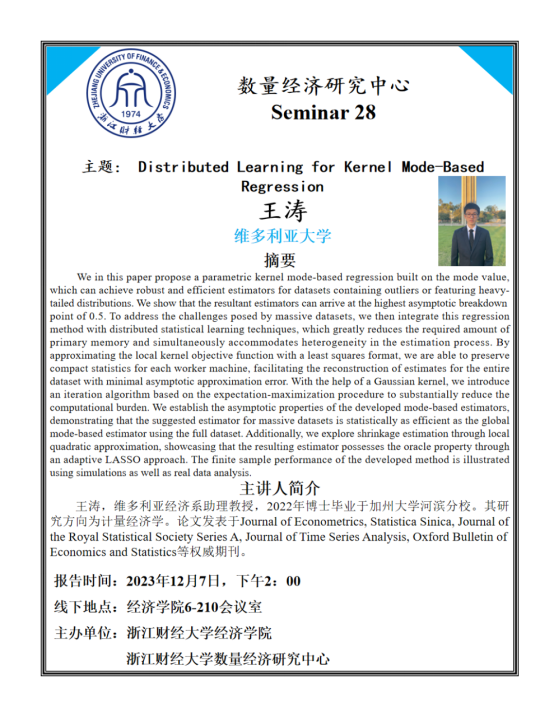 王涛,加拿大维多利亚大学经济系助理教授,2022年博士毕业于美国加州大学河滨分校。其研究方向为计量经济学。论文发表于Journal of Econometrics, Statistica Sinica, Journal of the Royal Statistical Society Series A, Journal of Time Series Analysis, Oxford Bulletin of Economics and Statistics等期刊。