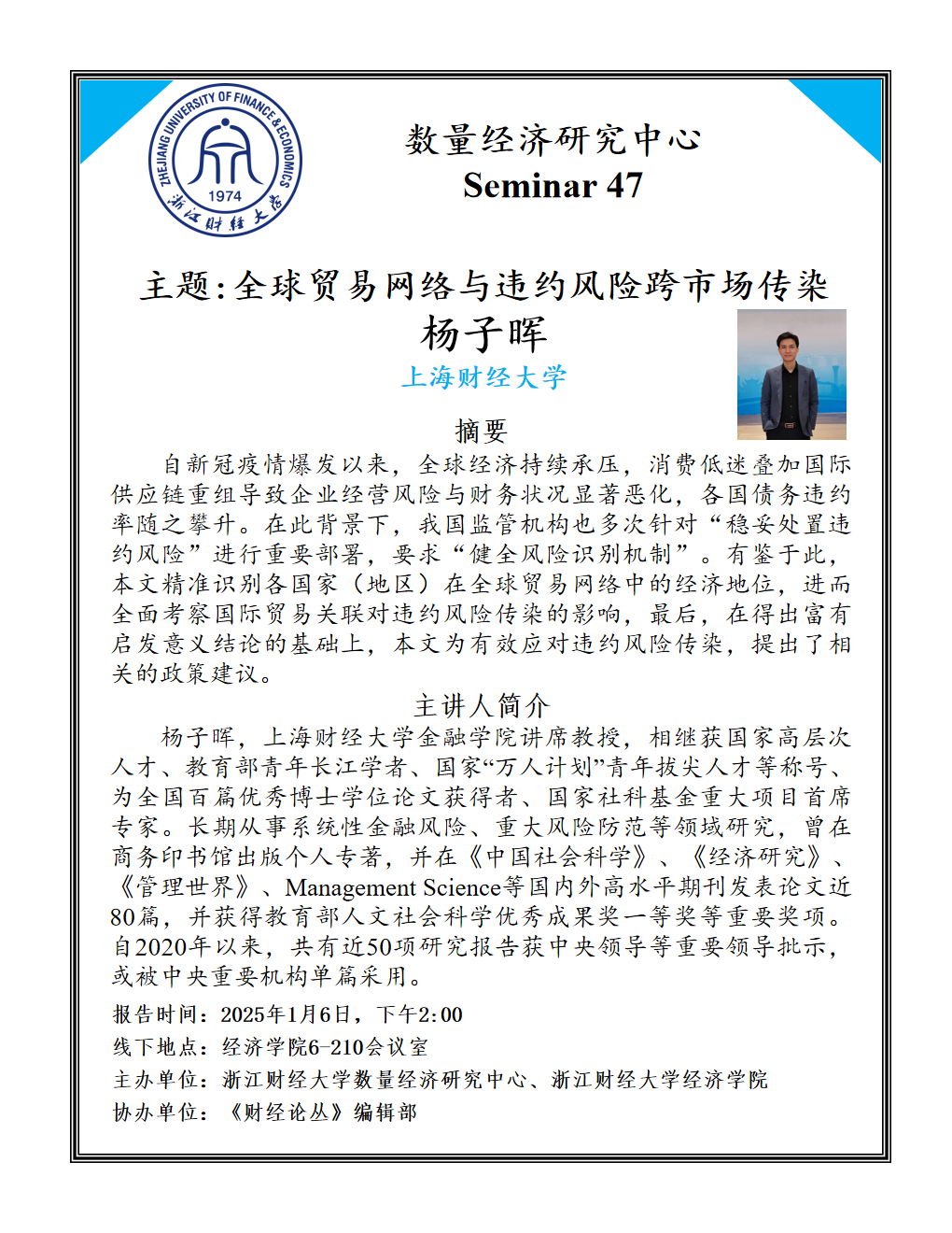 主讲人简介:杨子晖,上海财经大学金融学院讲席教授,相继获国家高层次人才称号、教育部青年长江学者、国家“万人计划”青年拔尖人才、为全国百篇优秀博士学位论文获得者、国家社科基金重大项目首席专家、教育部新世纪优秀人才、青年珠江学者。曾以第一(或独立)完成人身份获得以下奖项:入选2024年度《国家哲学社会科学成果文库》,教育部高等学校科学研究优秀成果奖(人文社会科学)一等奖(第八届)、二等奖(第九届),省级哲学社会科学优秀成果特等奖(1次)、一等奖(4次)、三等奖(1次),《中国社会科学》2020年度(首届)好文章,第九届张培刚发展经济学优秀成果奖,刘诗白经济学奖(第四届、第五届),青年经济学者论文奖,第九届金融图书金羊奖,省级金融学会优秀金融科研成果一等奖。