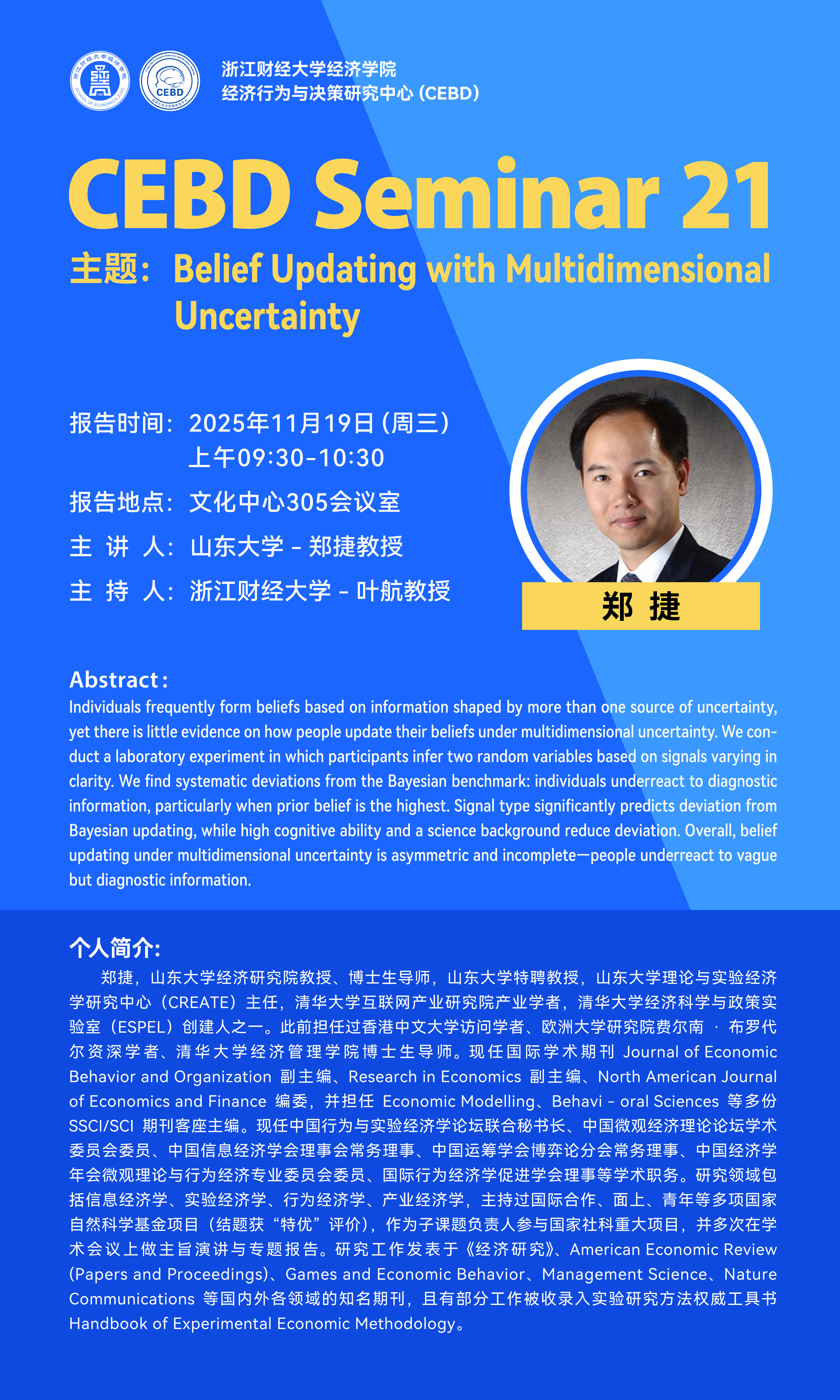 郑捷,山东大学经济研究院教授、博士生导师,山东大学特聘教授,山东大学理论与实验经济学研究中心(CREATE)主任,清华大学互联网产业研究院产业学者,清华大学经济科学与政策实验室(ESPEL)创建人之一。此前担任过香港中文大学访问学者、欧洲大学研究院费尔南·布罗代尔资深学者、清华大学经济管理学院博士生导师。现任国际学术期刊Journal of Economic Behavior and Organization副主编、Research in Economics副主编、North American Journal of Economics and Finance编委,并担任Economic Modelling、Behavi - oral Sciences等多份SSCI/SCI期刊客座主编。现任中国行为与实验经济学论坛联合秘书长、中国微观经济理论论坛学术委员会委员、中国信息经济学会理事会常务理事、中国运筹学会博弈论分会常务理事、中国经济学年会微观理论与行为经济专业委员会委员、国际行为经济学促进学会理事等学术职务。研究领域包括信息经济学、实验经济学、行为经济学、产业经济学,主持过国际合作、面上、青年等多项国家自然科学基金项目(结题获“特优”评价),作为子课题负责人参与国家社科重大项目,并多次在学术会议上做主旨演讲与专题报告。研究工作发表于《经济研究》、American Economic Review (Papers and Proceedings)、Games and Economic Behavior、Management Science、Nature Communications等国内外各领域的知名期刊,且有部分工作被收录入实验研究方法权威工具书Handbook of Experimental Economic Methodology。