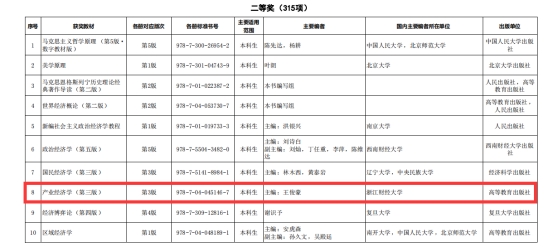 王俊豪教授主编、高等教育出版社出版的《产业经济学》荣获“全国优秀教材二等奖”(高等教育类)。
