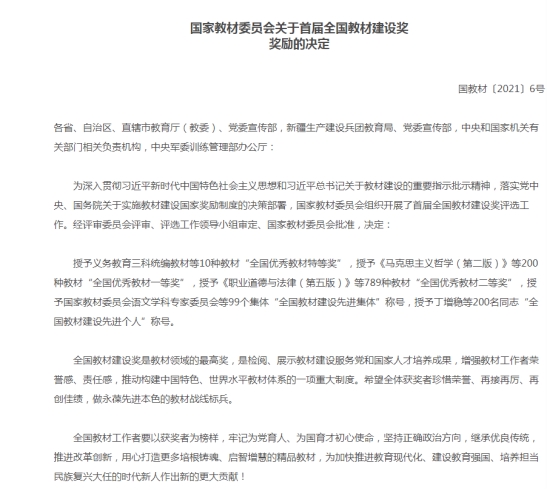 近年来,学院高度重视教材建设工作,在严把教材政治意识形态同时,鼓励课程与教材一体化建设,支持新专业/课程的教材建设,并设立专项经费资助教材出版。本次上榜首届全国教材建设奖,是学院教材建设的重大标志性成果,是对前期学院教材工作的充分肯定。