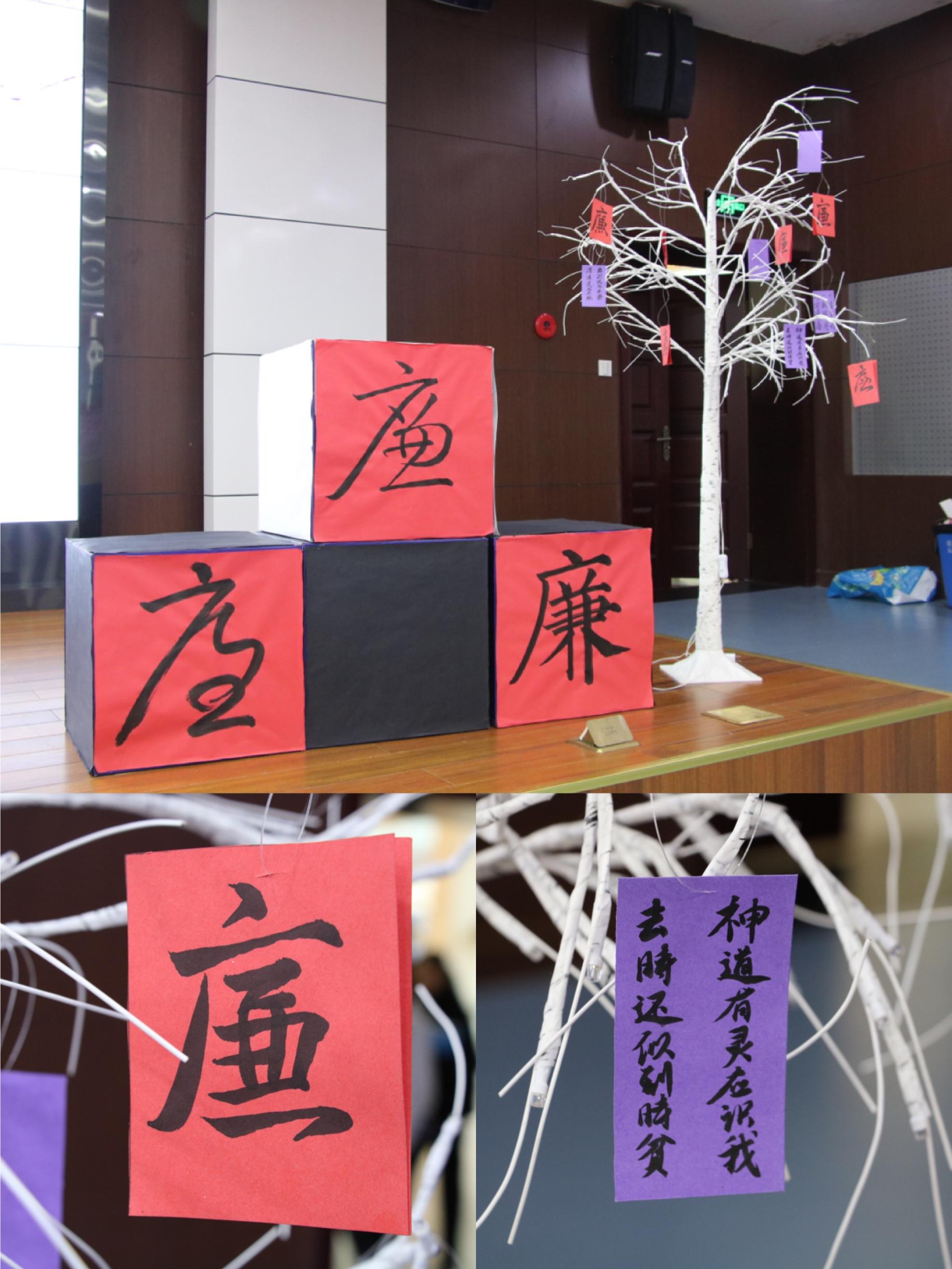 另外,比赛舞台上放置的立方体、报告厅门口摆放的展板等都是工作人员二次利用学生活动材料制作而成的,变废为“廉”,也是践行廉洁理念的体现。