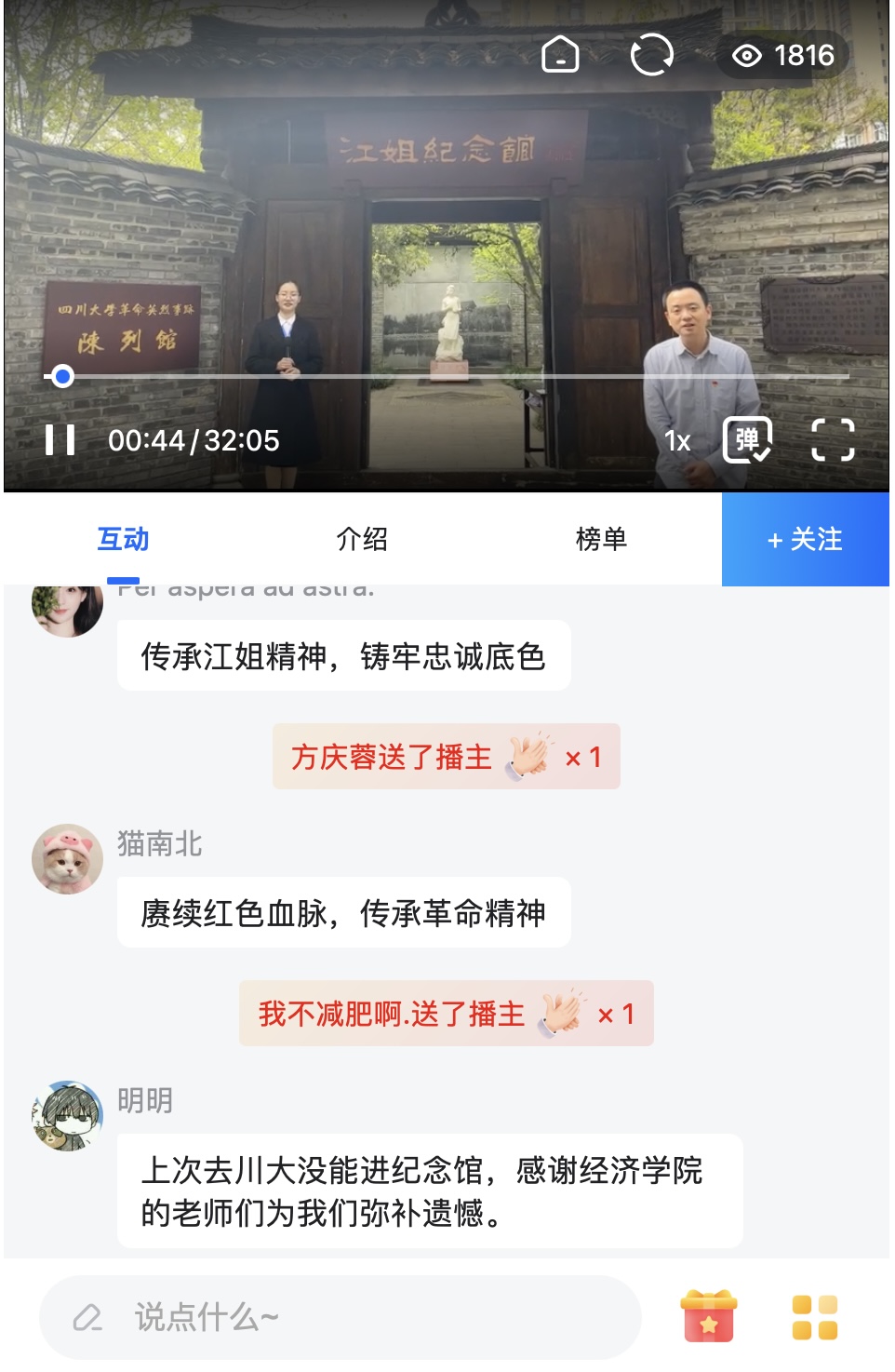 党委“经昇”宣讲团带领学院党员代表前往四川大学江姐纪念馆开展“行走的思政微课——经昇宣讲之江姐纪念馆”寻访宣讲活动,并通过线上直播的方式将宣讲内容传播给2000公里以外的在校师生们,线上直播平台的在线学习人数达到1800余人。