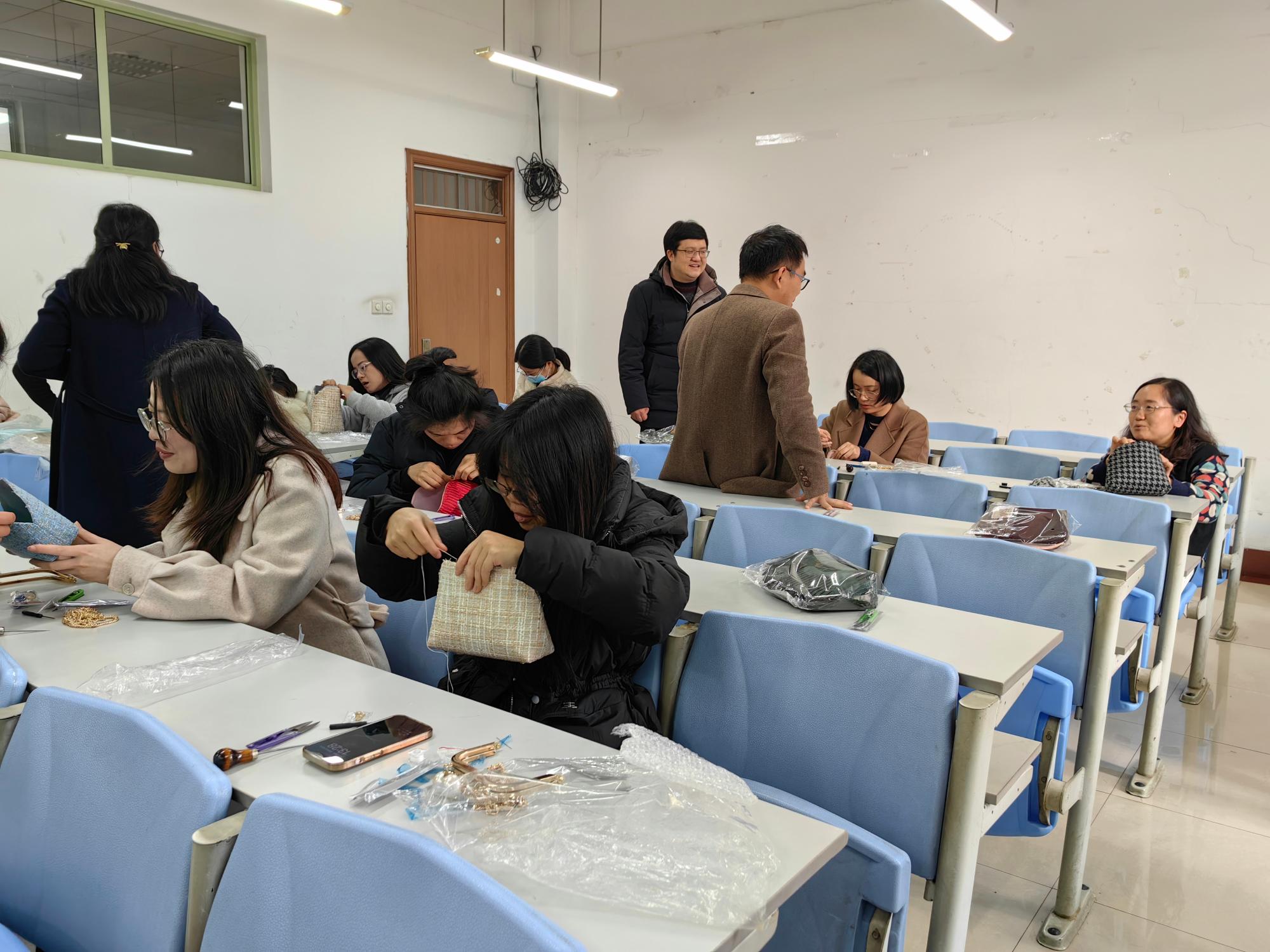 制作过程中,老师们选取自己喜欢的半成品材料后,按照手工包老师的指导步骤认真进行缝制、卡夹、拧合。老师们时而自己动手,时而合作拧螺丝,在愉快轻松的环境里,包包制作过程中的各种问题都迎刃而解,一个个精美时尚的手工包就此出品。