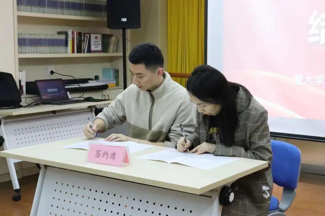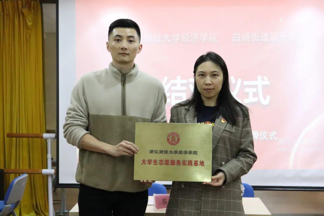 随后,学院团委书记曹仲晔与晨光社区团支部书记吴媛红上台签订了大学生社会实践基地协议书,共同完成了挂牌仪式,并合影留念。