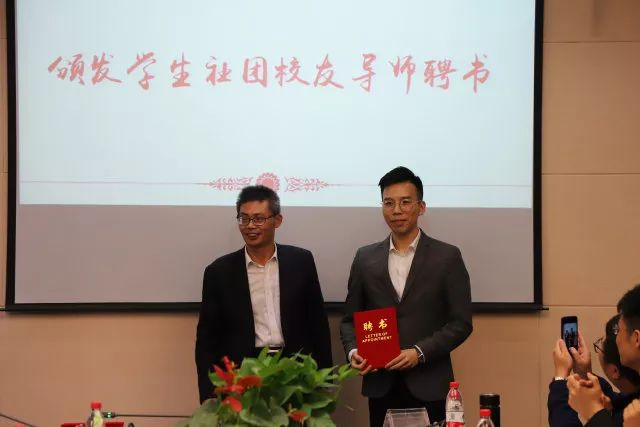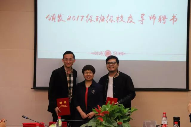 校友理事会增补名单。副院长王正新宣读了2017级班级校友导师、学生社团校友导师、创业导师增补名单。随后,院长胡亦琴和党委书记沈水法老师为校友导师、创业导师颁发聘书。