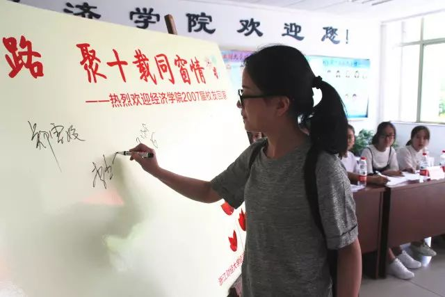 校友们登记并领完纪念品后在kt板上留下自己的签名。
