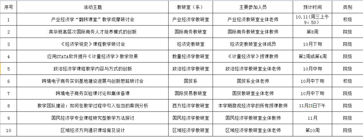 2、活动获得立项后,具体活动时间由各教研室自行商定,并提前一周将主题、主讲人(视情况而定)、时间、地点等上报学院教学办公室,以便教学办公室及时发布活动通知。