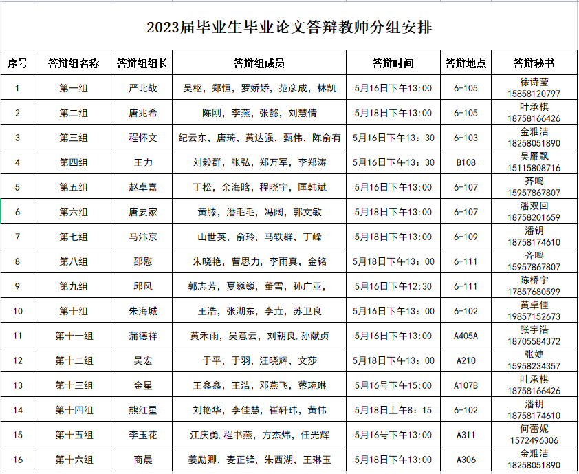 按照学校《关于2023届本科生毕业论文(设计)工作安排的通知》的要求,确保同人漫画 2023届毕业生毕业论文开题答辩工作高效、有序开展,同时方便各答辩组教师灵活安排,学院决定采用分组、分时的方式进行开题答辩,拟安排在5月16日-18日进行毕业论文答辩。现将答辩教师分组及答辩时间公布如下:
