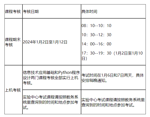 请登录教务系统【信息查询】查询个人考试信息,并按系统显示的考试时间和地点参加考核。其他课程如有变动,请以考试当天监考老师公布为准。课程考核时间也可在12月28日(下午四点之后)登录教务处网站-通知公告-校内通知查看具体通知,不按规定的时间地点参加考核,导致成绩缺失或成绩无法正常录入的,其后果由学生本人负责。请同学们留意各教学班级的通知,按时参加考试。