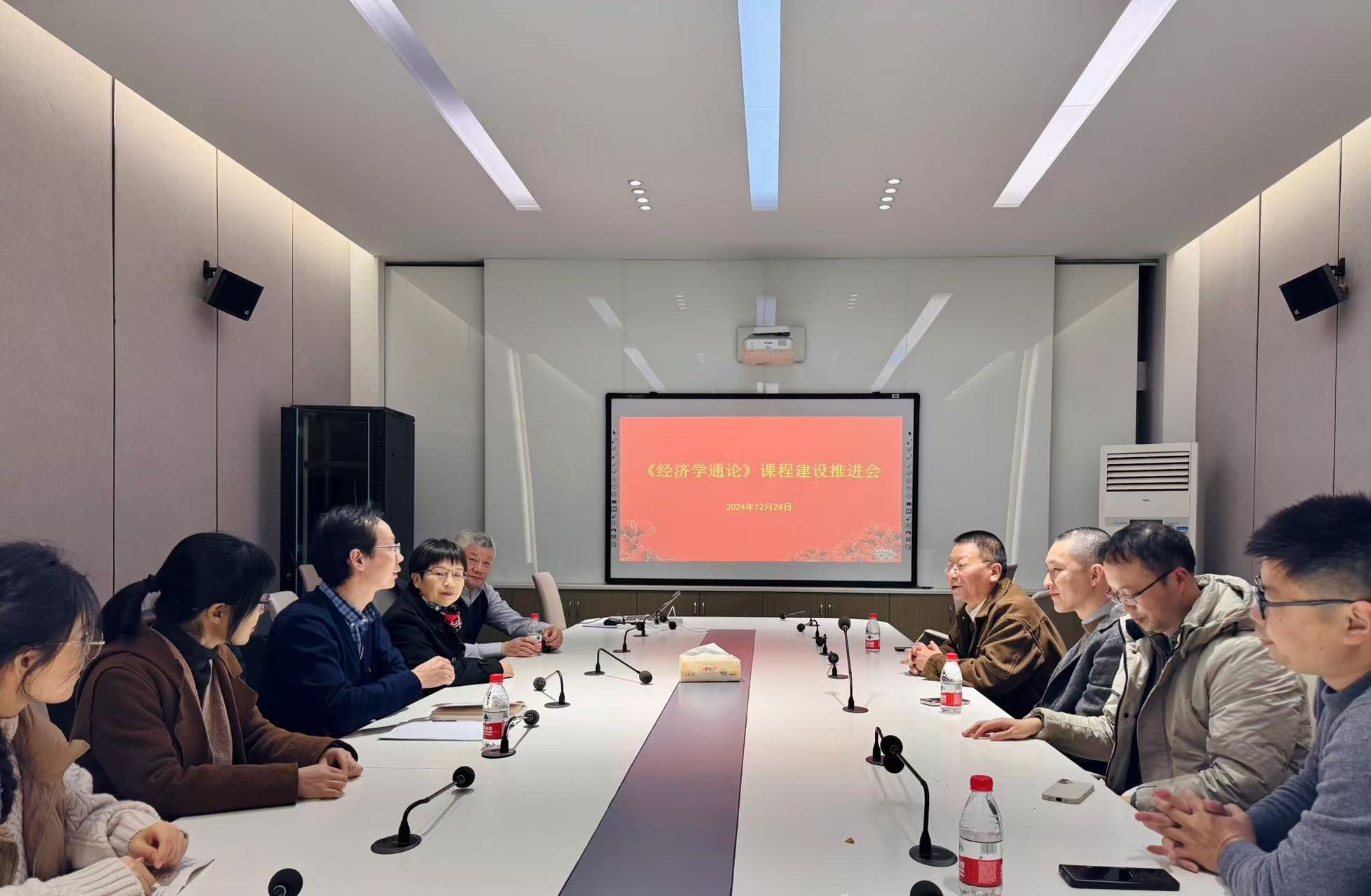 在经济行为与决策研究中心会议室召开校级通识教育核心课程《经济学通论》建设推进会。会议由课程负责人王力教授主持,学院副院长邓晓军及课程组全体教师参加。